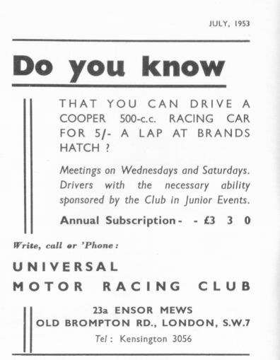 Inzerát lákající na placené jízdy v Brands Hatch, 1953.