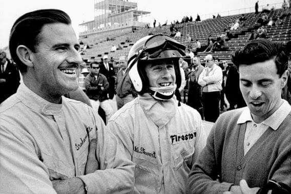 Graham v družném rozhovoru s Jackiem Stewartem a Jimem Clarkem, Indianapolis, 1966.