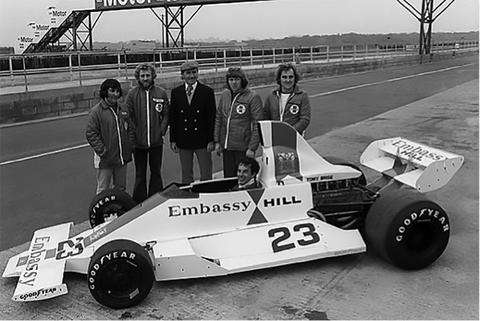 Testování monopostu Hill GH2 na okruhu Silverstone.
