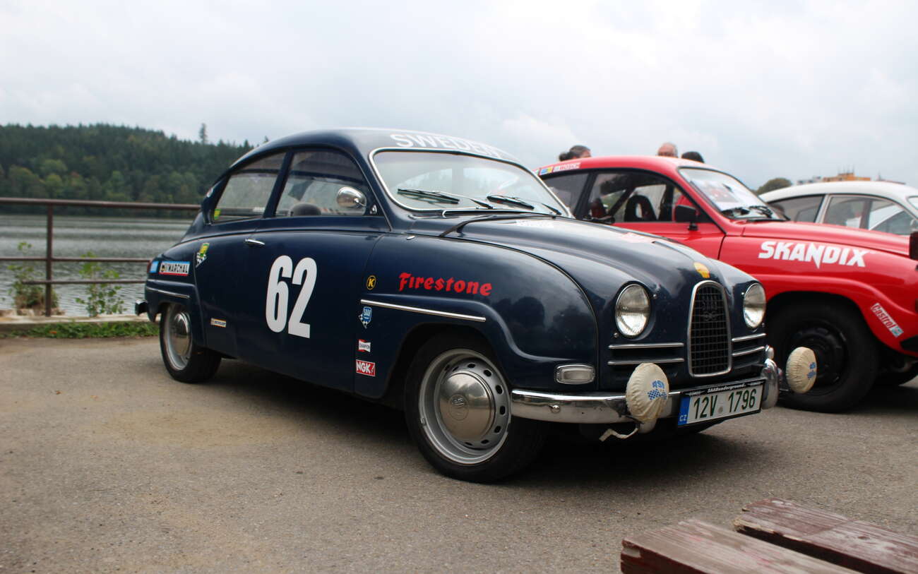 Saab 96 polepený po vzoru dobových amerických závoďáků. Fotograf: