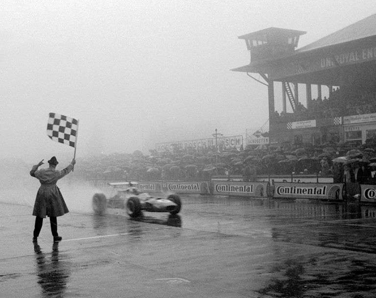 Stewart vidí šachovnicový praporek jako první, Nürburgring, 1968