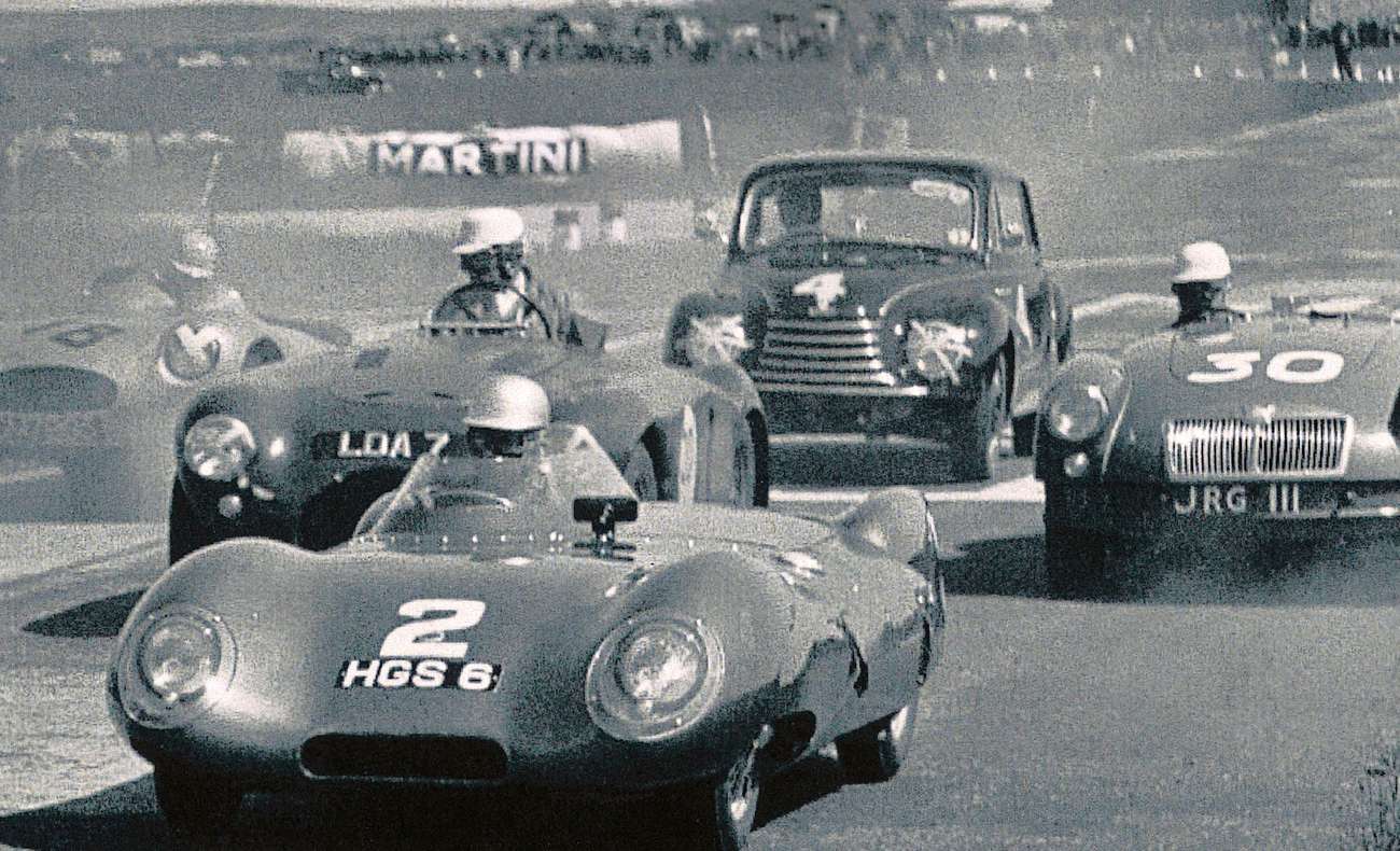 Jim s vypůjčeným vozem DKW (startovní číslo 4) mírně vyčníval z řady, 1956.