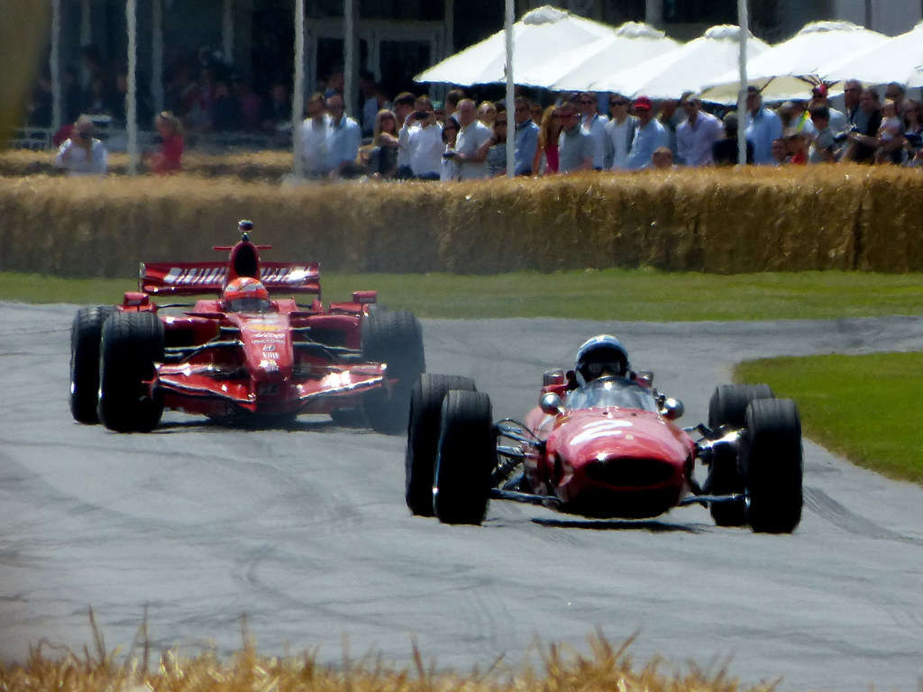 Surtees a Kimi Räikkönen se v roce 2014 projíždějí se svými mistrovskými vozy v Goodwoodu.