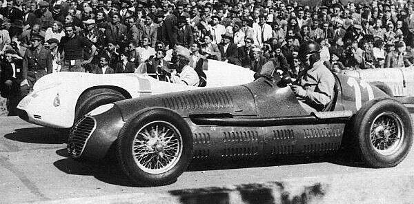 Maserati 4CLT/48 britského jezdce Davida Murrayho, za ním je Tatraplan Sport jezdce Bruna Sojky, Masarykův okruh, 1949.