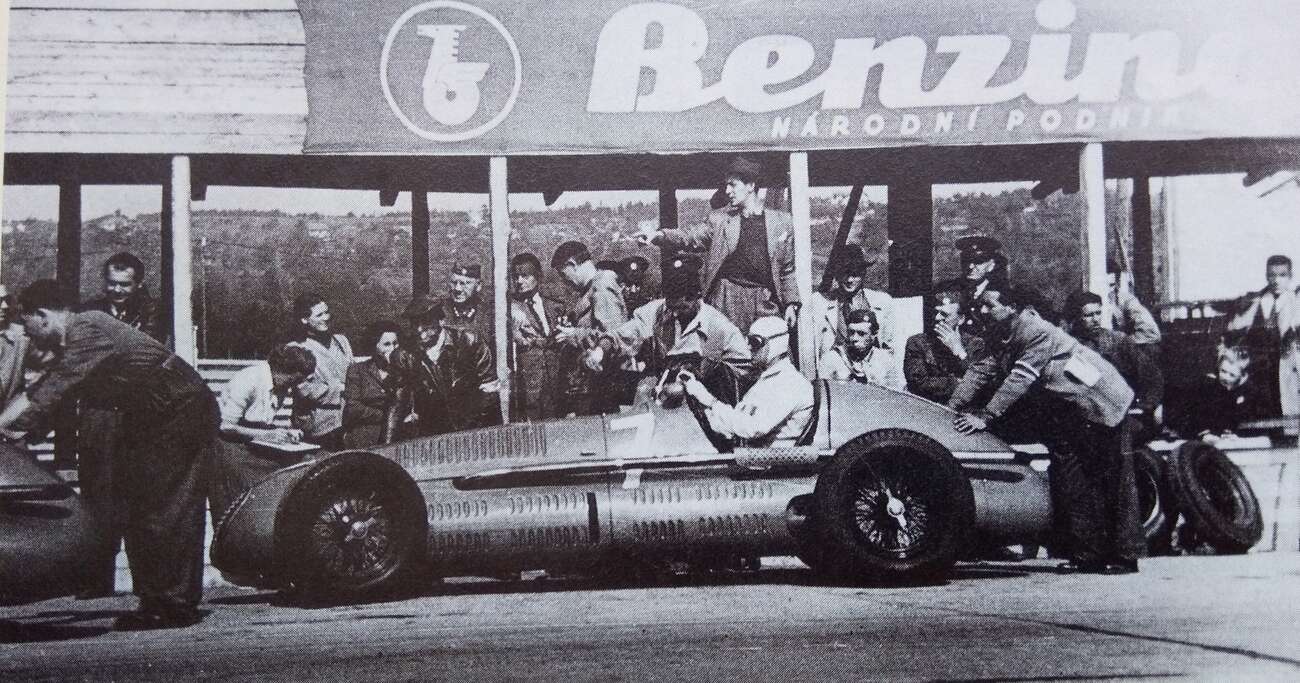 Louis Chiron připraven vyrazit na trať za volantem Maserati 4CLT/48, Masarykův okruh, 1949.