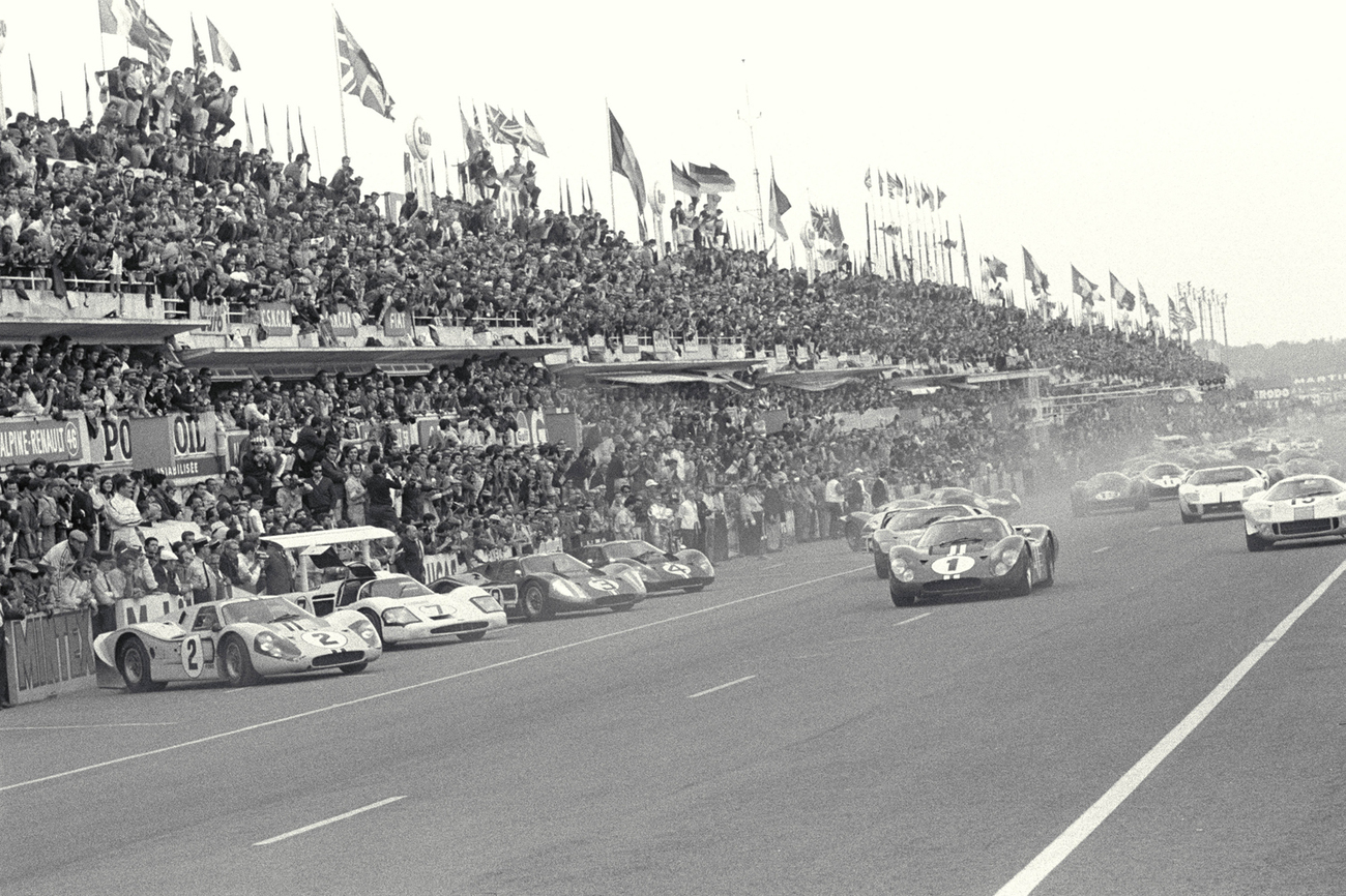 10. června, den velkého závodu. V boxech probíhají poslední přípravy, vášnivé diskuse se týkají především taktiky Fordova týmu, kterou Carroll Shelby úzkostlivě tají. Na okruh přijíždí okolo půl milionu diváků, kromě samotného závodu je tu čeká bohatý doprovodný program. Nachystáno je 100 000 litrů vína i 6 tun zmrzliny. Nervozita před startem je téměř hmatatelná. A potom to všechno úderem šestnácté hodiny začne. Start všech 54 vozů proběhne bez větších potíží, Fordy se ihned usadí na vedoucích pozicích. Po dvanácti odjetých kolech zastavuje v depu první GT40, Denis Hulme si stěžuje na zasekávající se plynový pedál, chvíli po něm míří k mechanikům i Frank Gardner s dalším Fordem, tentokrát se kvůli špatnému vyvážení mění pravé přední kolo. Po hodině závodu nastává první vlna doplňování paliva. Zde dojde k potížím při tankování Chaparralu. A přicházejí další potíže u Fordu. Ronnie Bucknum si stěžuje na přehřívání motoru. Na vině je netěsná trubka chladícího okruhu. Protože mu regule závodu neumožní doplňovat provozní kapaliny dříve než za 25 kol, může být provedena jen provizorní oprava a Bucknum musí příštích 40 minut kroužit pozvolnějším tempem, než bude možno provést řádnou výměnu vadné trubky a doplnit chladící kapalinu. Na trať se vůz vrací až na 42. místě.