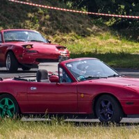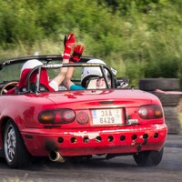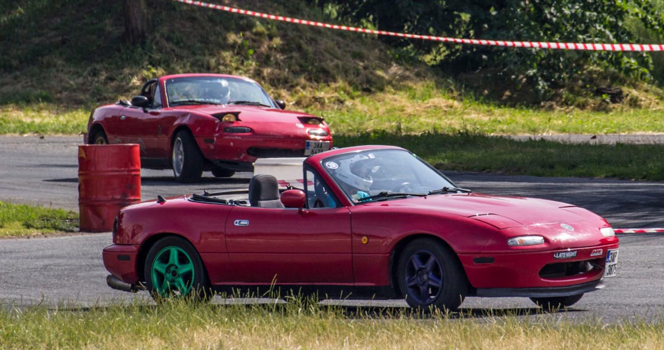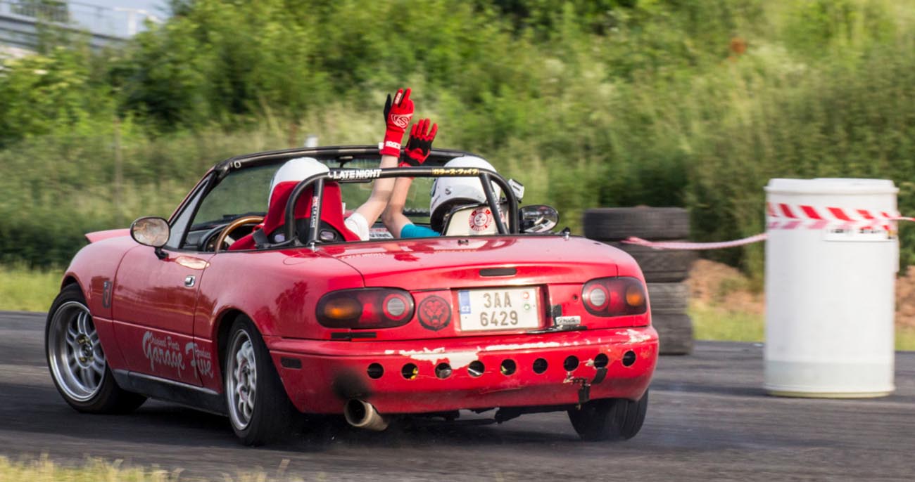 Na místě doznívá předchozí akce. Sporťáky naložené na přívěsech se pomalu ztrácejí z asfaltové plochy a nakonec nám zbývá jen jeden z pořadatelů a skromný přístřešek se stolem. Ještě, že máme s sebou Katku. Přebírá vyjednávací iniciativu a výsledky se dostavují. Pořadatel předchozí akce se uvolil, že nám poslední zbytky vybavení zapůjčí, abychom se zbytečně nepařili na ostrém sluníčku. Na vysokých svazích podél trati žloutne tráva a sem tam postává zvědavec, dumající nad tím, proč drahé unikáty vystřídal Ford velikosti bačkory a prastarý Ital vydávající zvuky přístavního škuneru. Na místě na nás již čeká banda Miaťáků se dvěmi NA a jednou NB. Přebíráme závodní dráhu, vybalujeme pito i malinovku a já hledám způsob, jakým bych se bezpečně uklidil z trati. „Můžu mávat?“ Ptám se Vojty a doufám, že se tak vyhnu alespoň na čas ztrapňování se na okruhu. „No asi můžeš, až bude co“. Tak jo, budu užitečný. Ostatní členové redakce budují zázemí a Martin mlsně obchází Pumu. „Chceš se projet?“ Odtuším zájem v jeho pohledu. „No jasně!“ Vyhrkne bez přemýšlení a div mi s klíčky nesebere i kus prstu. Souká se za volant, hledá ideální pozici a diví se, proč mám zpětné zrcátko přilepené oboustrannou páskou. Raději zamlčuji, že mi ho z čelního skla utrhla sestra, když se učila řídit. Po chvilce hledání a mačkání těch správných páček startuje motor, načež se malá šelma mlsně rozhlíží po trati. Jsme na dráze úplně sami, já sedím na sedadle spolujezdce a libuji si v mém vychytralém plánu. Totiž nejdříve od někoho okoukat, jak se to vlastně závodí. Martin bez rozvah dupe na plyn a Puma jen lehce hrábne předními koly, načež vystartuje s razancí lovícího geparda.