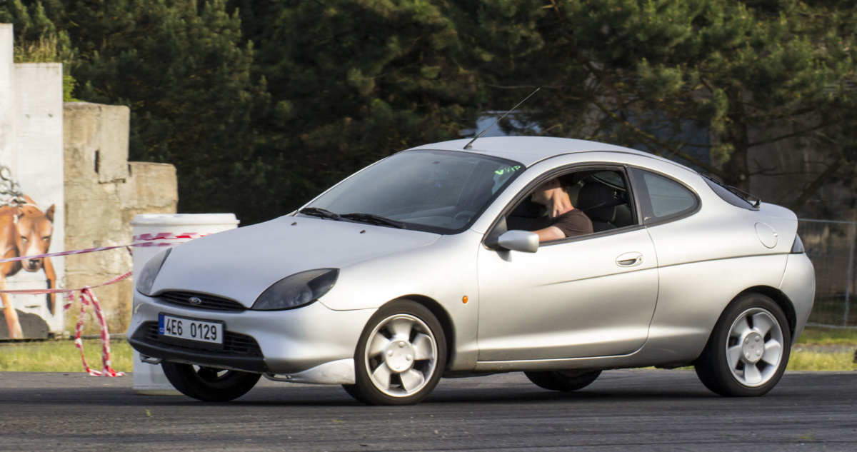 Vyrazil jsem na trať, přičemž má bedra si stále ještě pamatovala přesuny váhy, které můj nadaný nový přítel předváděl po příjezdu. Zlehka jsem si zajel trať tak, jak bych jel, kdybych měl na veřejné silnici náladu zlobit. No nic moc. Puma je fajn, ale tohle znám. Vzpomněl jsem si na starou poučku, která praví, že jedině člověk bez pudu sebezáchovy jezdí naplno. Tak jsem se zmíněný pud pokusil vypnout a stalo se následující: Puma vystřelila jako splašená, hrabala svými malými pneumatikami a dožadovala se přísunu většího množství paliva. Dravost po otáčkách se mi snadno dostala do krve. Instinktivně jsem začal úplně jinak řadit. Při nájezdu do zatáčky jsem dupl na brzdy, auto se zavrtělo jako kočka připravená vyrazit za kořistí. Máš to mít, pomyslel jsem si a podřadil jsem na dvojku, pustil spojku, sešlápl plyn. Ucítil jsem zadní nápravu, kterak se na jedné straně odlehčuje, zavily pneumatiky a malý hatchback obkroužil zatáčku jako po kolejích. „Takhle se vypíná sebezáchova?“ posmívalo se mi auto. Tak tedy více plynu, méně brzd a rychlejší pohyby volantem. „Nudáá“ vrněla si Puma. Hlavou se mi mihlo jen „máš to mít kočičko“ a dál si to nepamatuju. K sobě jsem přišel, když jsem vylézal z dochlazujícího se vozu a na tváři jsem měl nesmazatelný podpis talentovaného vozu pro gaye. Rohlík od ucha k uchu ne a ne zmizet. „Tak co?“ „Boží“ zhodnotil jsem celý zážitek. Svezl jsem se ještě párkrát a pokaždé mě dostal pocit, že mě talentovaný Fordík předává něco ze svých schopností. Jak se na obzoru objevovaly mraky a dusno přestávalo být snesitelné pro řidiče i pro vozy, zaveleli jsme k ústupu.