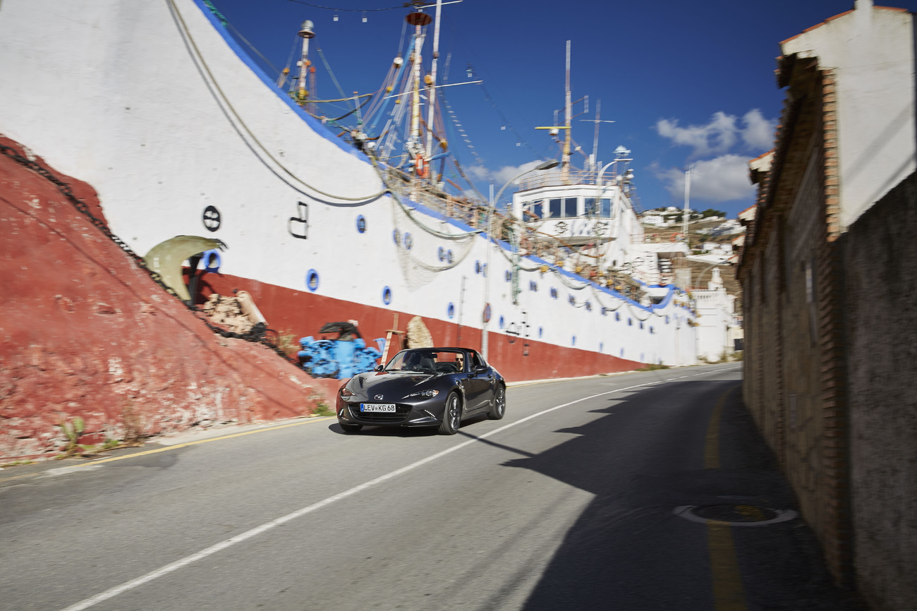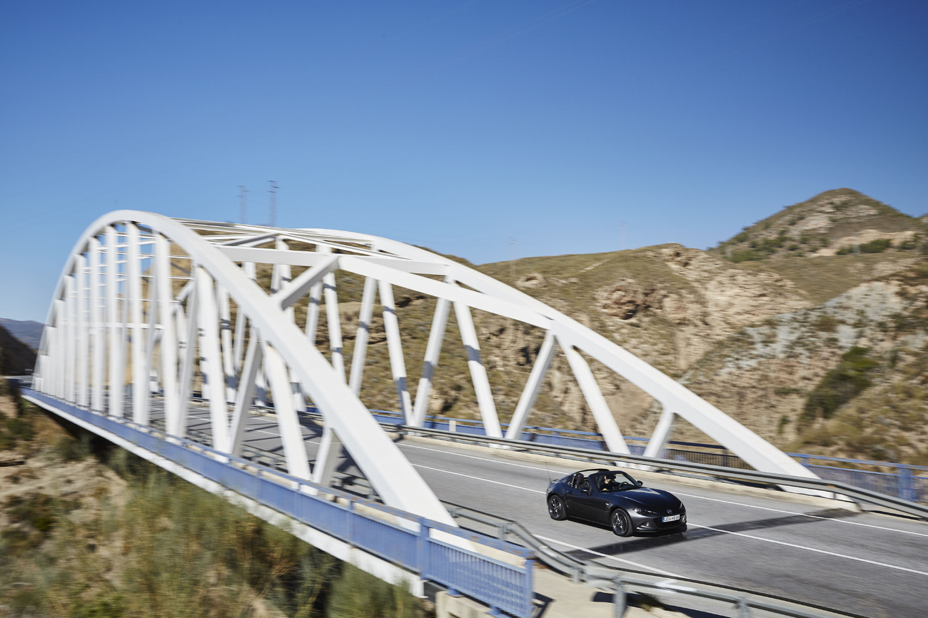 Hmotnost MX-5 kvůli propracovanému mechanismu střechy narostla o nikterak závratných 45 kilo. A zadní sloupky jsou sice pohyblivé, ale přesto – i díky rozpěře umístěné mezi nimi – příznivě ovlivňují tuhost karoserie v krutu. Konstruktéři z Mazdy toho využili způsobem pro ně typickým, tedy nečekaně, ale přínosně. Vyšší tuhost karoserie doplnili o měkčí naladění stabilizátorů, tlumičů a pružin, protože jim „stačilo“, aby RF byla v zatáčkách stejně rychlá jako výchozí karosářská verze. Výsledkem je auto, které je v normálním provozu komfortnější a v zatáčkách poddajnější, tedy hravější a taky přetáčivější, když o to stojíte.