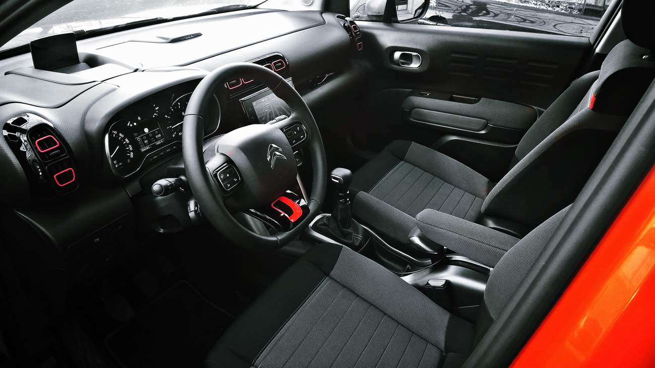 Uvnitř také na první pohled poznám, že sedím v Citroënu. Zajímavé materiály a textury přístrojové desky, barevné detaily a velká obrazovka radiomapy přebírající většinu funkcí. Zkrátka Citroën. Jsou tu však i první důvody ke stížnostem. AirCross má být jakousi rodinnou variantou Citroënu C3, tak bych očekával kabinu plnou praktických detailů, přihrádek a ‘Simply clever’ řešení. Jenže ouha, ona tu nejsou. Ano, je tu malá pogumovaná polička před spolujezdcem, která se ukázala překvapivě použitelnou, je tu i prostor před řadící pákou s bezdrátovou nabíječkou mobilního telefonu, avšak nějak se zapomnělo na všelijaké schránky a kapsy. Středový tunel si pro sebe uzmula ruční brzda. Její páka (nebo snad madlo? Pádlo? Prostě něco, čím se jistě ovládá něco hodně důležitého ve stroji o velikosti letadlové lodi) zabírá veškerý prostor za řadící pákou. Není tu ani kam dát kelímek s kávou.