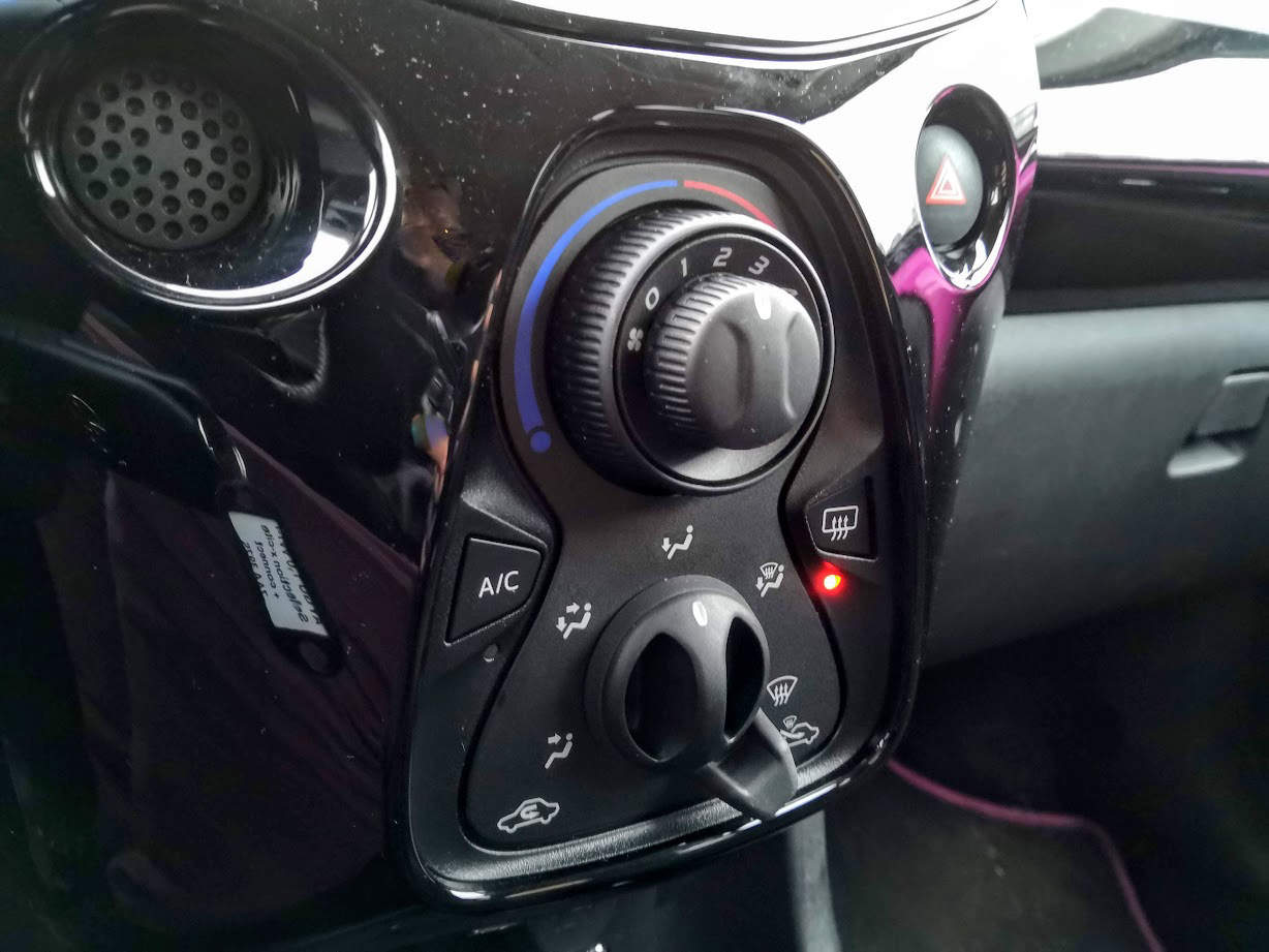 Samostatný odstavec si zaslouží ovládání topení a klimatizace. Na rozdíl od v létě testovaného Peugeotu 108, ve kterém byl jinak prakticky stejný interiér, disponovalo Aygo jen základní manuální klimatizací a obyčejným panelem topení. Ten se sestává ze tří točítek, dvou tlačítek a jednoho posuvníku. V horní polovině najdeme jakýsi “dortík” sestavený ze dvou otočných ovladačů posazených na sebe, kterým lze ovládat intenzitu a teplotu vháněného vzduchu, otáčedlem ve spodní části nastavíte směr proudění. Retro atmosféru tohoto ovladacího ústrojí podtrhuje táhlo uzavírající vnitřní cirkulaci vzduchu. To je totiž ryze mechanické, jde trochu ztuha a jeho přepnutí doprovází tlumené “žbuch” z útrob palubní desky. I když to možná působí trochu archaicky, je to celé sympaticky jednoduché a nekomplikované.