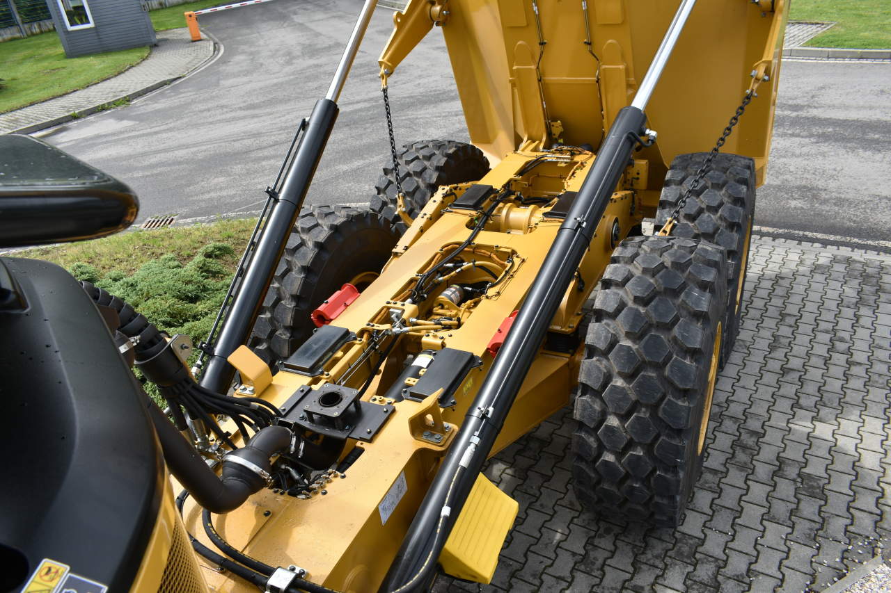 Od běžných náklaďáků se žlutý kolos liší hlavně ve dvou bodech. Zaprvé rozměry. Jasně, je to větší než pražský byt za 3 miliony, ale ono je to velké jaksi úplně všude! Začněme třeba pneumatikami. Ty jsou vyšší, než Vavrisova Miata. Nebo nápravy. Takové snopy oceli neuvidíte ani pod lokomotivou. Táhlo k otevření čela korby by po zabetonování mohlo chránit pařížské chodníky před rozjetými kamiony a pak je tu konečně středový kloub. Osa, kolem které se zlamuje celý automobil, musí pobrat veškeré hrubé zacházení a desítky tun nákladu, aniž by se vůz rozlomil vedví. Podle letmého pohledu na rozměry hydraulikou ovládaného ústrojí bych se tedy o životnost nebál. A zde se dostáváme k druhému bodu. Zatímco běžné nákladní vozy používají k usnadnění ovládání zatáčení, brzd a spojky tlakový vzduch, tenhle CAT má vše hydraulické. Kdo se s hydraulikou někdy setkal, jistě rád potvrdí, že má skutečnou sílu. Obyčejný píst na stahování střechy v mém kabrioletu neměl problém přepůlit hliníkový telefon zapomenutý v jeho útrobách a tahle bestie má písty silnější než moje paže. Na svých zádech umí odvézt 28 t, což je jen tak pro představu maximální povolená hmotnost kloubového autobusu nacpaného ve švech a to ho ještě ke všemu umí zvednout nad hlavu při sklápění korby.
