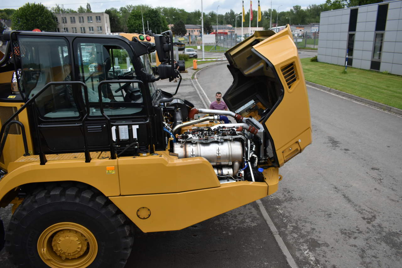 Zaparkovat vedle náklaďáku, který svým objemem zabírá více místa než váš byt, už docela zapůsobí. V řadě vedle sebe stálo šest strojů typu Cat 730. Hrubým popisem jde o třínápravové důlní tahače s hydraulickým systémem zatáčení, ale tyhle hračky mají svojí konstrukcí do běžných náklaďáků daleko. Začněme hnacím ústrojím, které ještě se světem silničních vozidel něco společného má. Srdcem prozatím spícího behemota je řadový šestiválec o objemu 12,5 l. Tento motor lze nalézt v celé řadě výrobků CAT a objednat si jej můžete i pro takové to domácí kutilství jako samostatnou jednotku. Pod kapotou sklápěče podává výkon 375 koní a při 1200 ot/min poskytuje krouticí moment 2 141 Nm (SAE J1995). Tedy na klice a bez příslušenství, ono toho je po cestě od setrvačníku k zvířenému prachu pod koly ještě docela dost. Evropská unie nikdy nespí a její konejšivý a vševědoucí pohled nalezl i nebohé důlní stroje. A tak na palubě najdeme turbodmychadla (ano balast emisních opatření postihl i dvanáctilitrové šestiválce), přímé vstřiky, řízený katalyzátor, filtr pevných částic a konečně vstřikování močoviny.