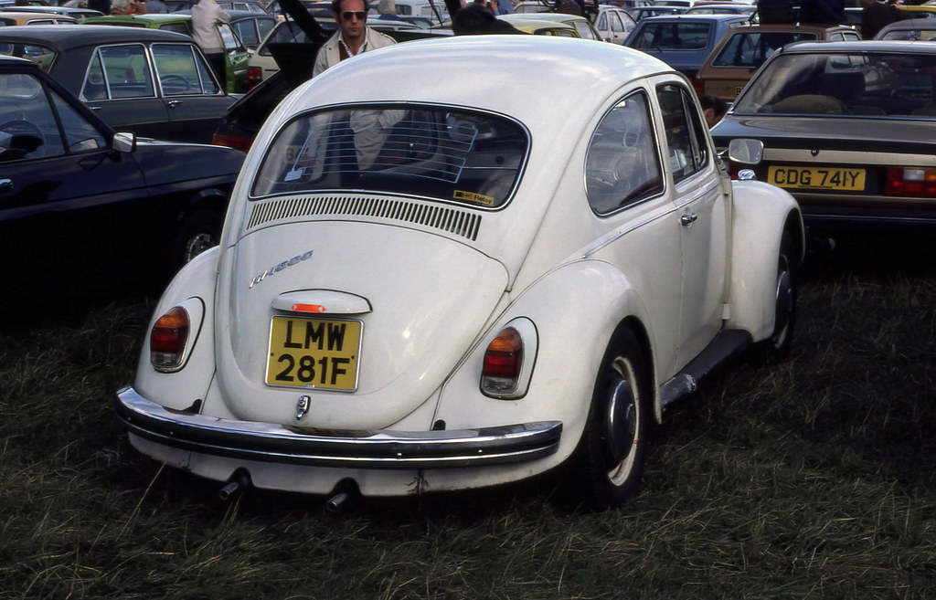 Pořád nic? No, nejste sami, taky by nás to nenapadlo, ale prý tenhle brouk stojí v rozporu s platnými předpisy. Tehdy se totiž prý v Británii nesmělo parkovat dvěma koly na chodníku. Nevím, nakolik je to pravdivé, opodál stojící bleděmodrý Triumph Herald parkuje stejně. Nicméně někomu ve Volkswagenu asi tato situace ležela dlouhých padesát let v žaludku.