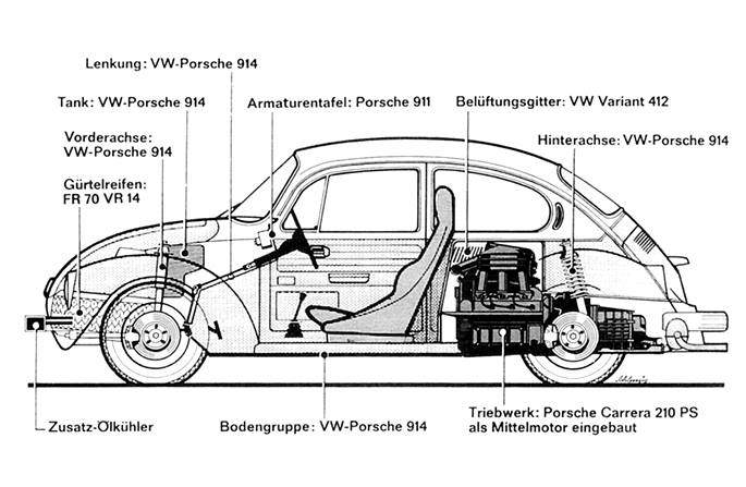 Celá “skořápka” se zkrátka rozřízla přesně v polovině a do vzniklého prostoru navařili v Nordstadtu dalších 23 centimetrů materiálu. Takový skelet samozřejmě pozbýval torzní tuhost (která by ani tak nestačila na příval síly z velkého osmiválce) a tak celá stavba spočívala na trubkovém rámu. Výsledný vůz ale nebyl žádný odbytý bastl – zvenčí vypadala na první pohled podezřele (kromě úctyhodné šířky) jen větší a širší kola. Jiné to ale bylo v interiéru – ten byl převzat kompletně z Porsche, jen výplně dveří byly dodělané na zakázku.