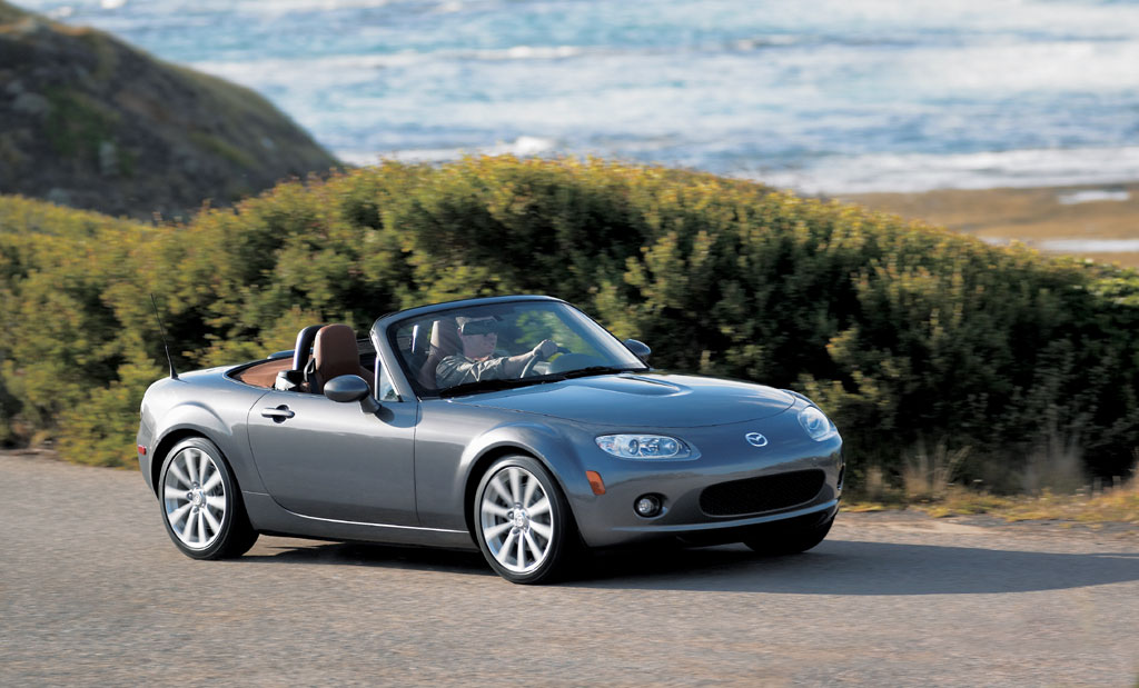 Pamatuji si docela živě na jaro roku 2011, kdy jsem se jel se svou ‚novou‘ modrou NB 10 th Anniversary projet za kamarády do Beskyd. Přede mnou jela Alfa GTV, za mnou Civic Type-R a já celou cestu poslouchal směsici krásných mechanických automobilových zvuků, z nichž ani jeden nevydávala moje Mazda – ta totiž nebyla vůbec slyšet. Rozený elektromobil. Sériová Miata postrádá jakýkoliv smysl pro drama či strach. Krom zvukové kulisy nemá talent ani pro jiné postupy zaručující okamžité zježení chlupů a silnou nejistotu v bříšní dutině. Spojka je lehká a lýtko by z ní nebolelo snad ani po dvou týdnech soustavného užívání, motor nemá výkonové skoky a kopance, jízdní vlastnosti jsou přátelské a ani vzhled neděsí, nýbrž rozesmívá. Stručně, Miatě chybí koule. Je to prostě hodné a milé sportovní auto. Pokud se chcete bát pokaždé, když vezmete za vrata do garáže, a při otevření dveří auta se vám rovnou rozklepou kolena, hledejte jinde…