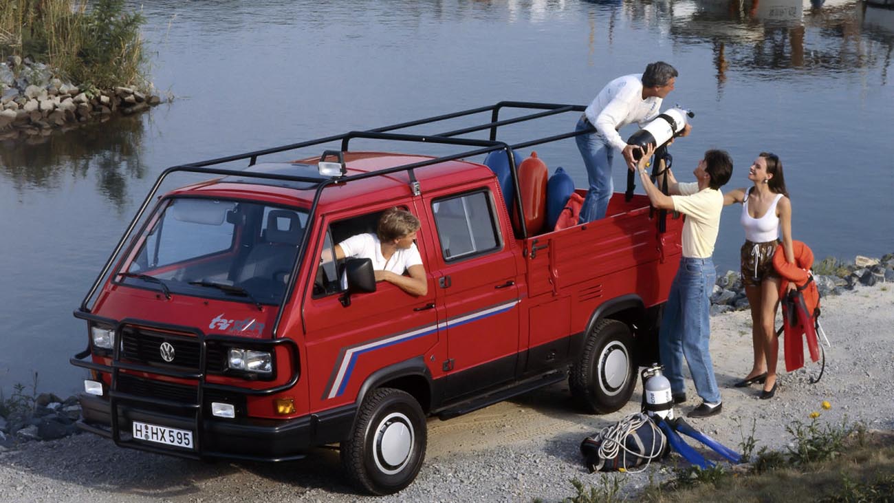 Představovat legendární Transporter snad nemá význam, místo toho se rovnou zaměřím na třetí generaci, která bývá často neprávem opomíjena. Pod matoucím názvem ‚Type 2 T3‘ si zapěl svou labutí píseň koncept Volkswagenu s motorem vzadu. První ročníky T3 měly ještě kulatá světla, bohatě oplastovaná dle tehdejší módy. Ten správný šmrnc dostal Transporter až po faceliftu v roce 1986. Čelo vozu ozdobila čtveřice hranatých světel a mezi nápravami se objevil příplatkový symetrický pohon všech kol s obchodním označením Syncro. V zádi si spokojeně kadlal přeplňovaný řadový čtyřválec s ohromujícím výkonem 70 koní. Vůz se sice mohl pyšnit ideálním rozložením váhy, avšak výkony i terénní schopnosti poněkud komplikovala váha atakující 1,7 tuny. Dnes se z užitkového staříka pomalu stává sběratelský kousek a ceny obytných a terénních verzí již dávno překročily rozumné meze. Oproti svým předchůdcům nepůsobí T3 rozevlátým, natož květinovým dojmem. Naopak je z něj cítit dobový vzdor a chuligánství. Volnou lásku vystřídala agrese, místo konopí se pod sedadlo nastěhovaly metamfetaminy a drnkání na kytaru vzalo za své s prvními akordy punku. Historie se tehdy razantně otřásla a T3 zůstala zajímavým symbolem přelomu generací.