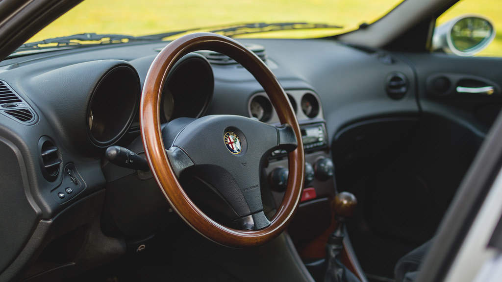 Podobné to bylo i uvnitř. Srovnání s konkurencí nemělo význam, tady bylo všechno jinak. Výrazné tubusy rychloměru a otáčkoměru připomínaly staré dobré časy Alfy Romeo, minimalistická středová konzola nesla další tři ukazatele, všechno působilo až spartánsky, dravě a sportovně. A potom tu mohl být dřevěný volant. Opravdový tovární dřevěný volant. Krásný, jemný a dokonale padnoucí do interiéru Alfy. Samozřejmostí byl výběr různých odstínů kůže či speciálního syntetického semiše, který Alfa Romeo nazývá Alfatex. Svou trochou do mlýna přispěly i společnosti Momo a Recaro.
