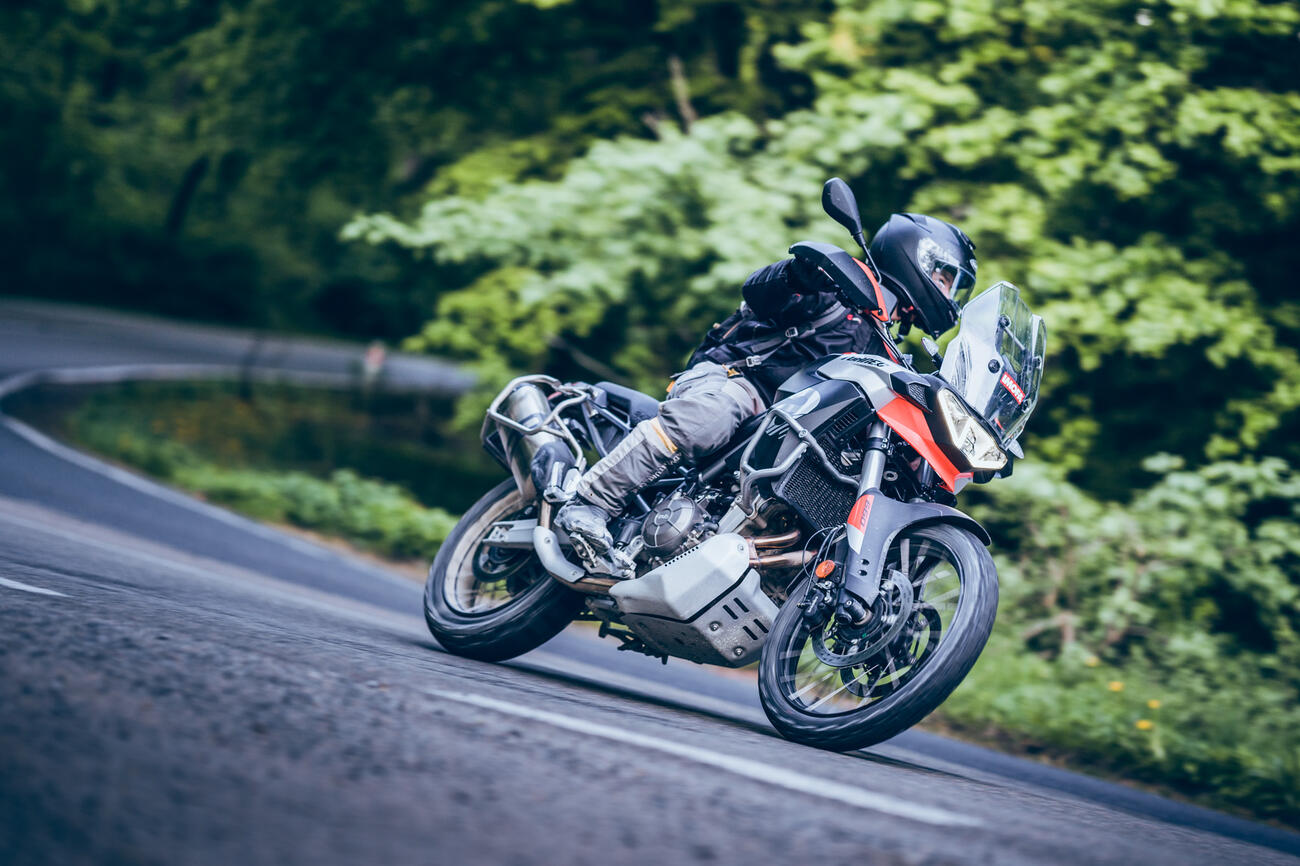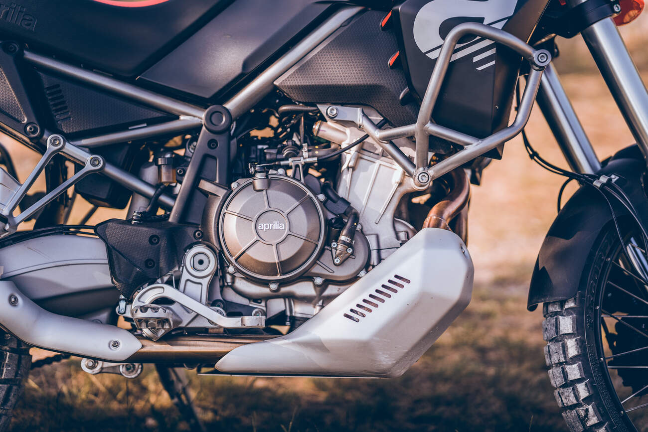 Pohyb vpřed tu obstarává řadový dvouválec s 270° klikou a tradičně vzhledem k názvu nepřekvapivým objemem 660 ccm, známý z několika ostatních modelů. Ano to je ten typ (crossplane), co se má projevovat vidlicově. Po zkušenosti se stejnou konstrukcí u Yamahy se mi tomu nechtělo ani věřit. Přesto, tady se tak vážně chová, je to úplně něco jiného. Italští konstruktéři oželeli několik vrcholných hřebců a kvůli předpokládanému použití v terénu raději posílili krouťáky ve spodních patrech otáčkoměru. Pětasedmdesát procent už ve třech tisících, hlásá brožurka, věřím tomu. Jezdí se s tím fakt hezky, rozjíždět se dá skoro bez plynu. Navíc mám pocit, že mi to snad ani jednou nechcíplo. Vůbec nevadí, když nepodřadíte o dost kvaltů, vždycky můžete vzít za plyn a ono to prostě pojede. Řazení jde dost hladce a přesně, i když má řadička docela dlouhý chod, na který jsem si musel chvilku zvykat, vždycky jsem trefil vše, včetně neutrálu. Zní to samozřejmě, ale třeba u své motorky s hledáním neutrálu bojuju i po roce. Aprilia tu používá „plyn-po-drátě“ (ride-by-wire), takže si můžete nastavit jeho reakce i motorovou brzdu, jak ostré chcete. Bezprostředně po startu občas trochu zaváhal s volnoběhem, jako by si přesně nepamatoval výchozí bod, ale stačí mu dát malou chvíli na rozkoukání. Při podřazování pak se mnou nějak nechtěl spolupracovat a propouštět meziplyny, jenže ona je tu i antihop spojka, takže podobné cavyky nejsou potřeba. Stárnu?