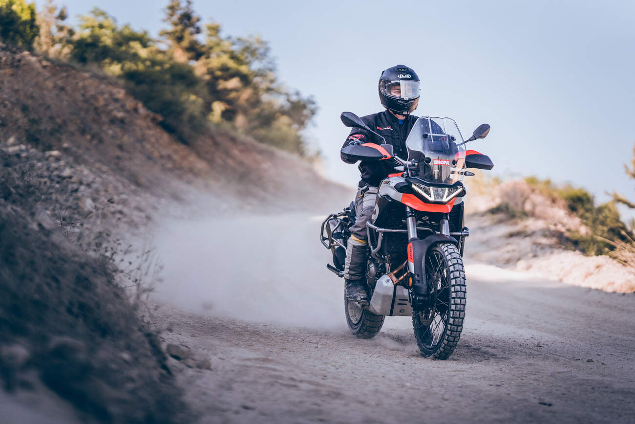 Ach ano, polní cesty a terén, to je skutečně místo, kde Tuareg dostává svému jménu. Řekl bych, že mnohem lépe než ten čtyřkolový. Prvotním obavám navzdory jsem to musel také vyzkoušet. Zdvihy a světlá výška, shodně 240 mm, aby se to dobře pamatovalo. Navíc díky velkým kolům, jednadvacet a osmnáct palců, obutých do pneu od Pirelli STR s masivními kostkami, které se do měkčího podloží zakusují o poznání ochotněji než do asfaltu, vám umožní pustit se do (téměř) čehokoli. Měkký podvozek od KYB, plně stavitelný na obou koncích, si taktéž poradí s čímkoli. Tady už bez “téměř”. Jelikož já ani zdaleka nejsem endurový jezdec takového formátu, abych s ním dorazil až na dorazy. Hardware je tu solidní a software nad vámi drží ochranou ruku, pokud chcete. Elektronika APRC (Aprilia Performance Ride Control) nabízí čtyři jízdní režimy – Urban, Explore, Offroad, Individual, přičemž poslední dva si můžete nastavit přesně podle sebe. Krom již výše zmíněných reakcí na plyn můžete, dokonce v několika stupních, omezit zásahy či úplně vypnout kontrolu trakce či ABS (vpředu i vzadu zvlášť). Nastavovat tedy musíte na místě, ale poté listovat mezi jednotlivými módy můžete v mžiku i za jízdy.