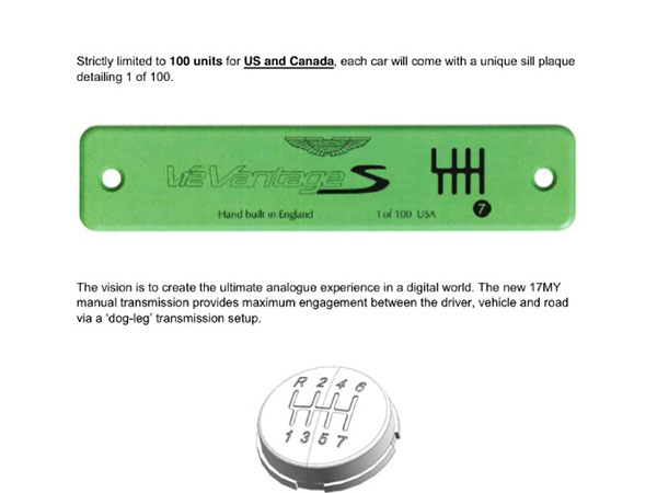 Celá tato zpráva zní sice naprosto skvěle, ale má to i svá úskalí. Podle uniklého obrázku, který odhalil mimo jiné právě i netradiční řazení, vypadá to zatím, že se V12 Vantage S vyrobí jen velmi omezená, stokusová série pro USA a Kanadu. Musíme tedy doufat, že u ní Aston nezůstane a přinese manuál i na další trhy.