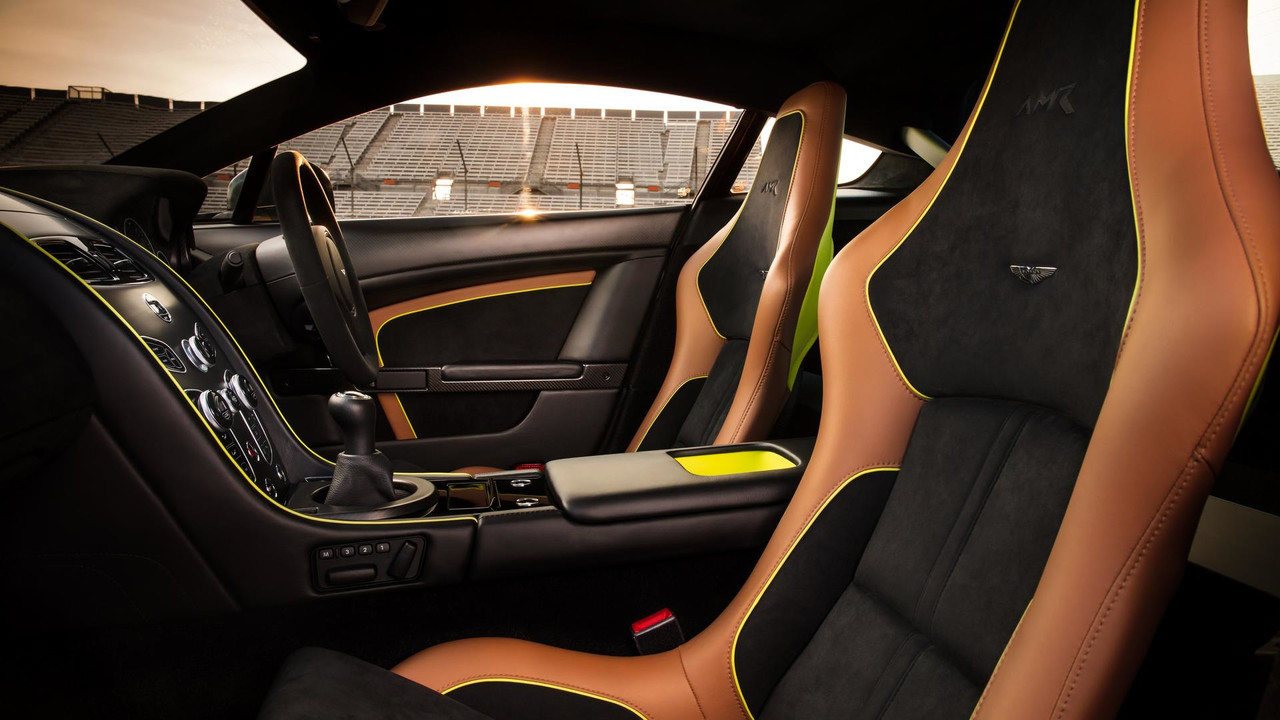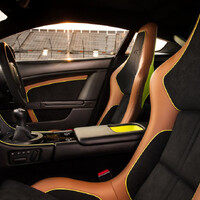 Interiér se nese v duchu exteriéru, takže se tu objevují fešná karbonová sedadla, čalouněná do kombinace kůže a Alcantary, dále nějaké to speciální prošívání, plaketa a nechybí ani zabudovaná kamera pro nahrávání traťových radovánek. Zvolíte-li paket Halo Pack, jehož součástí je i zmiňovaná zelená barva nebo znaky Aston Martinu, probarvené britskou vlajkou, dostanete do interiéru celou řadu decentně rozložených zelenkavých doplňků.