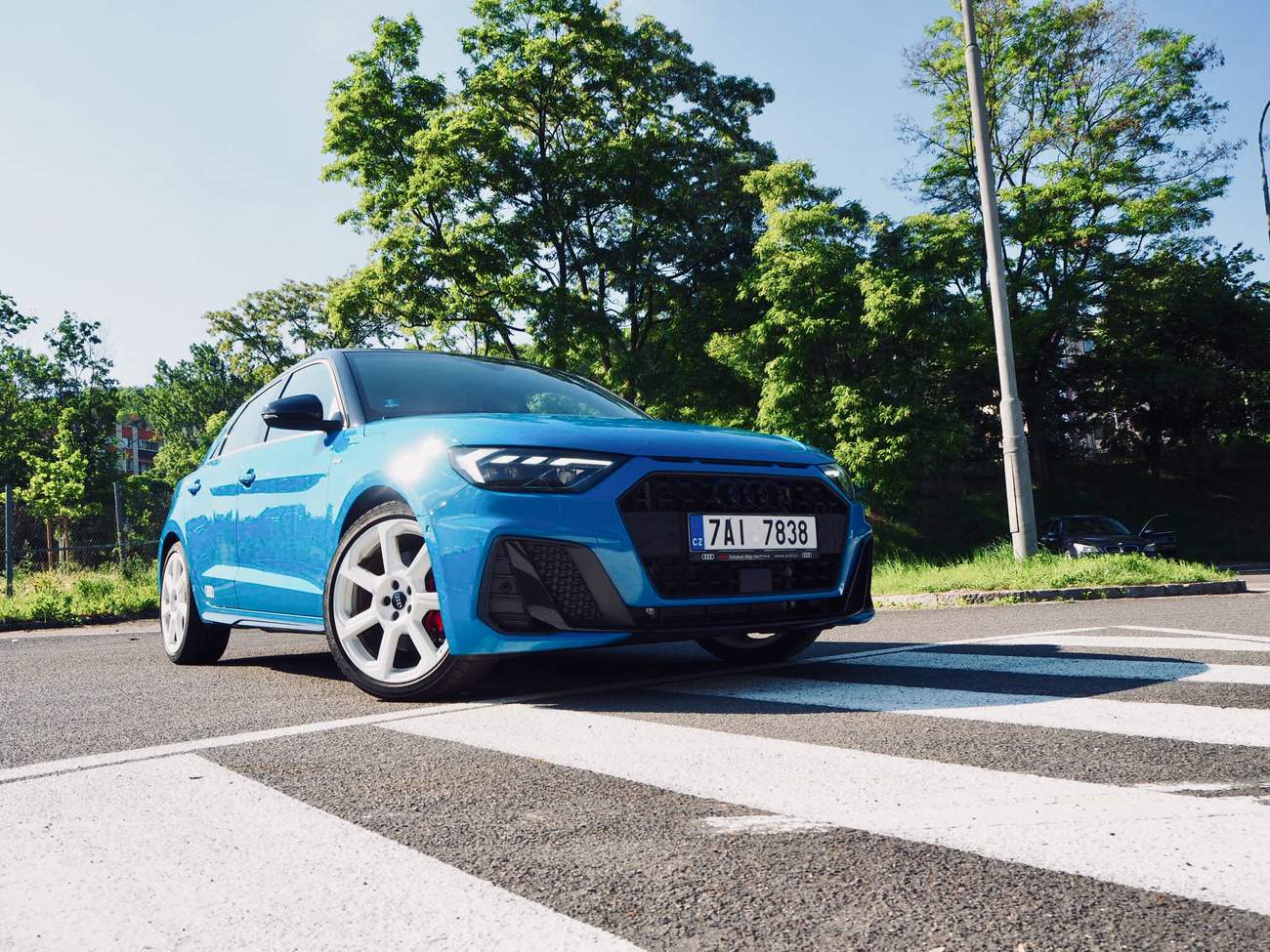 Testovaný vůz je nalakován do výrazné modři, střecha, sloupky maska a veškerá označení jsou vyvedena v leskle černé a aby těch barev nebylo málo, jsou tu bílé lesklé sportovní ráfky. Tohle auto vypadá zkrátka cool. A docela sportovně. Na zádi umístěný nápis 30 TFSI navíc snadno mate kolemjdoucí a dává plané naděje, že by pod kapotou mohl být vměstnaný nějaký přeplňovaný třílitr.