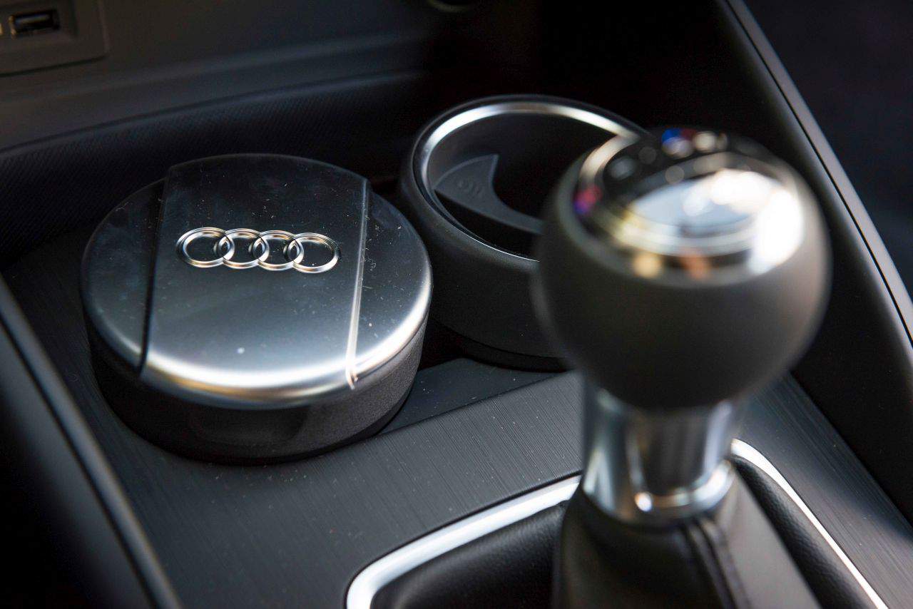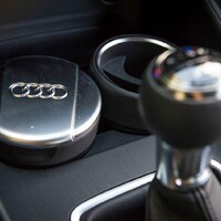 Držáky nápojů v testovaném voze okupují dvě vyjímatelné nádoby, jedna připomíná urnu s velkým logem Audi, druhá obsahuje přihrádky na klíč (který však díky absenci keyless systému spočívá ve spínací skříňce) a mobilní telefon rozměrů běžných v roce 2005. Moc užitečné.