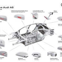 Vezměme to ovšem popořadě. Navenek se toho nezměnilo zase příliš. Audi zůstává velmi „audinovatá“ a s výjimkou spojených zadních světel nebudeme na nové A8 hledat nic moc nového. Snad jen ti opravdu pozorní si povšimnou předních LED Matrix světlometů s přídavnými laserovými světly. To důležité se totiž ukrývá uvnitř a jedná se o spojení mnoha materiálů, které vrcholnou limuzínu z Ingolstadtu zpevnily, ale zároveň odlehčily o přibližně 200 kilo.