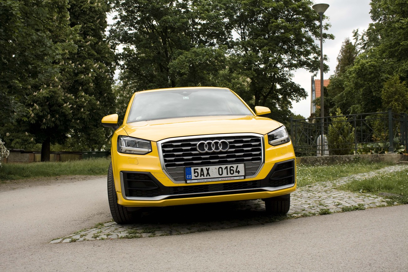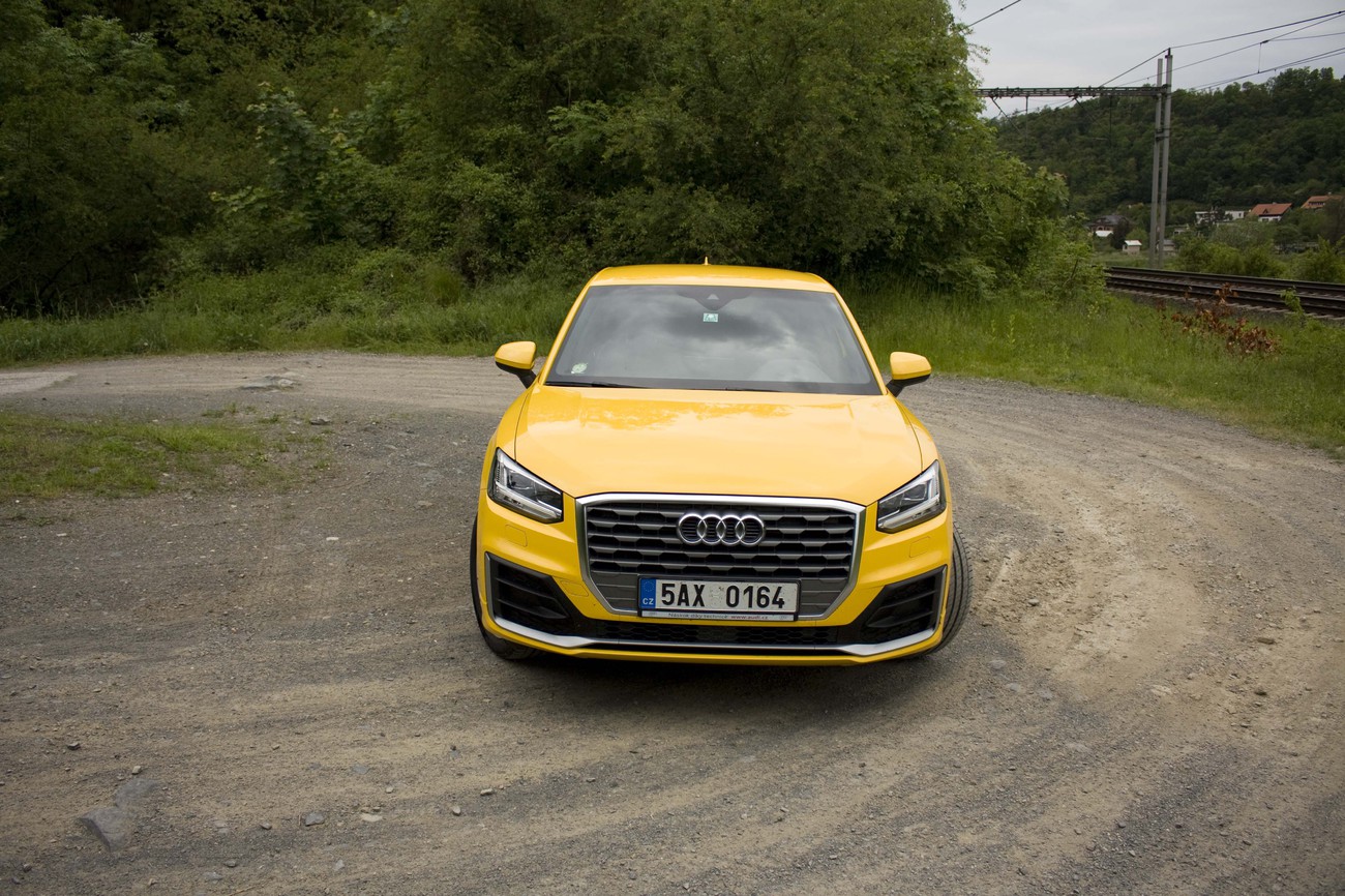 Q2 je možná nejmenší z rodiny, ale od větších příbuzných se rozhodně nenechá zastínit. Designově je na poměry Audi odvážné, až utržené ze řetězu. Samozřejmě si uvědomuju, že lví podíl na tom má žlutý lak Vegas, který dělá z auta nejen oblíbenou výletní destinaci křídlatého hmyzu, ale i magnet na pohledy ostatních účastníků silničního provozu. Pak je tu výrazný gril s matným povrchem a prolisy lemující dolní část karoserie, díky kterým působí dvojka trochu jako zvětšený angličák. Asi i proto mi k ní křiklavá barva dokonale sedí a usedlé mimikry kusů, jež jsem na silnici potkala, mi připadají k uzoufání nudné.