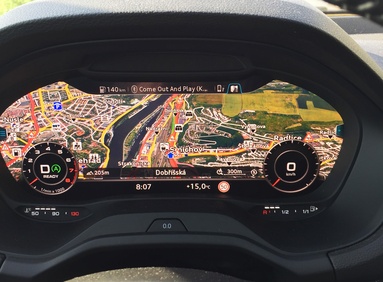 Pod volantem se nachází příplatková přístrojová deska Audi virtual cockpit, tedy kompletně digitální zobrazení různých ukazatelů. Staromilci už začínají brblat, jenže něco vám povím – tohle auto stejně není nic pro ně. Výhoda oproti klasickým budíkům tkví v tom, že se dá přepínat mezi dvěma režimy zobrazení. První režim ukazuje hezky velký rychloměr a otáčkoměr, druhá ‚budíky‘ zmenší a přidá k nim podrobné zobrazení mapy nebo radia (vida, hned dvě radiomapy v jednom autě…). Odkud budete velín ovládat, záleží jenom na vás. Jen samotný volant se hemží tlačítky, v nichž je jen třeba se zprvu trochu zorientovat a pak už z volantu nemusíte sundat ruce. Příjemné je i ovládání pomocí kolečka na středové konzoli. To funguje zároveň jako touchpad a můžete na něm prstem kreslit písmenka, podle nichž navigace vyhledává cíl. Velmi efektní. A nesmím zapomenout ani na bezdotykové ovládání stropních světýlek. Malé radosti, taky radosti.