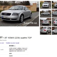Předmětem inzerátu je TT typ 8N z roku 2001. Ano, to je přesně ten model, u kterého se objevil problém s nadlehčováním zádě při vysokých rychlostech, což v mnoha případěch skončilo opravdu hnusnými nehodami. Ale nebojte se, Audi v rámci svolávací akce doinstalovalo přeživším majitelům menší spoiler, který sice podle mého trochu narušil vizuální integritu zadních partií, nicméně se vám nestane, že byste zahynuli při požáru vyvolaném nárazem do stromu po opuštění silnice v hodinách vyvolaných roztočením auta ve vysoké rychlosti. Jedincům s přiliš grafickou představivostí se tímto omlouvám.