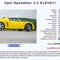 Opel Speedster? To je nejlevnější cesta k "Lotusu"… tedy pomineme-li klony "Sedmičky" té nejpodřadnější kvality. Tento konkrétní žlutý kus Speedsteru se zde objevil kvůli své ceně. Dáme krk za to, že při troše přemlouvání půjde stlačit pod 300 a to už je (v případě, že je auto v pořádku) velmi sympatická cenovka. Uprostřed vozidla sice tepe lehce nezáživný čtyřválec 2.2 o výkonu mrských 108 kw známý z Astry či Vectry, leč v kontrastu s 870 kg pohotovostní hmotnosti působí hned veseleji. Navíc se dá poměrně snadno přeplňovat buď aftermarketovými turbo kity nebo implementací kompresorové verze téhož motoru, jež jezdila v Chevroletu Cobalt. Když pominu samozřejmosti jako výtečné jízdní vlastnosti, tak už jen samotný fakt koupit si za 300 tisíc auto bez posilovače řízení, klimy a s okýnkama na kliku, je totální punk v tom nejlepším slova smyslu. A v podzemních garážích můžete parkovat zadarmo – průměrná závora začíná tam, kde Speedsteru končí rám okna… Odkaz je tady.