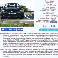 Poslední generace Mazdy MX-5 je s námi již 4 roky a dosáhla poloviny životního cyklu. Mezi různě starými a vybavenými exempláři vyčnívá tahle černá krasavice na bronzových kolech Sparco Asseto Gara a sníženém podvozku – z poměrně baculatého sériového ND je náhle dynamická šelmička přitisknutá k asfaltu a vypadá tuze dobře. Po dvou letech auto ztratilo zhruba 1/3 své hodnoty a to je příjemné, protože stále bude ještě 3 roky v záruce. Majitel ji prodává z důvodu častého a dlouhého cestování, a protože trávit velké porce kilometrů na dálnici v tomhle hadráku vážně nechcete, určitě bude ochoten vážnému zájemci ještě cosi slevit.
