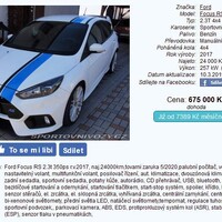 Mezi ojetými Focusy RS došlo k zajímavému paradoxu. Nová generace se sice dá považovat za stále nevychladlou novinku, avšak veliké problémy Fordu s defektním těsněním hlavy motoru ústící ve fatální závadu jsou již natolik veřejně známé, že zánovní RS pořídíte téměř za stejnou cenu, jako deset let starou předchozí generaci. Na severovýchodě republiky se nabízí tento Focus RS za lákavou sumu 685.000 Kč, přičemž je automobil stále v záruce.