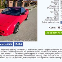 10. 4. 2017, 21:16Úvodní fotka mě dost pobavila. Totiž bazarový snílek a Krabův blog k sobě nemají vůbec daleko. Na tuhle MK1 MR2 se chci podívat osobně, zatím ale majitel moc nekomunikuje a kamarád co mu dal inzerát, tak nějak sporadicky. Nicméně dostal jsem velmi sympatickou odpověď, že pokud se sejdeme, tak mě rádi svezou, něco vyfotíme a pokud se to povede, rád vám o ní něco napíšu. Akorát se obávám nejhoršího. Že mě motor 4A-GE opět učaruje, tady navíc umístěný za zády, to je jasný. Otázka bude v jakým je to fakt stavu. ... doufám že to nebude skvělý, jinak fakt je to naprd. A já vážně nemám kam už to dát :(