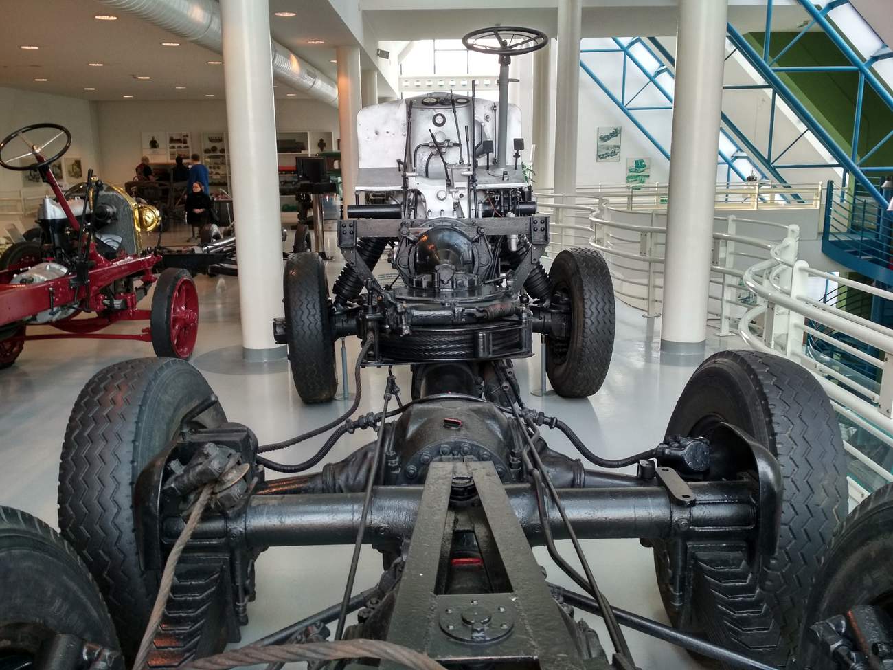 Podvozek posledního vodou chlazeného nákladního vozu je zajímavý především tím, že je vystavený zcela holý, bez kabin, pomocných rámů a nástavby. Lze tak detailně prozkoumat dílčí technická řešení vozu ze začátku čtyřicátých let. Co že je na nich ke zkoumání? Tehdy nebyly k dispozici plasty ani gumová těsnění. Napojení výkyvné nápravy na rám tedy obepíná asfaltované plátno. Jen zkoumání dobových odlišností vystačí na půl dne. Impozantně působí především rozměry. Víčko chladiče je téměř ve dvou metrech, a pokud slýcháte, že nová auta jsou větší než jejich předchůdci, kolos vyvíjený pro wehrmacht vás rychle vyvede z omylu. Malé děti se pod centrální nosnou trubkou procházejí, aniž by se musely sklánět.