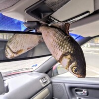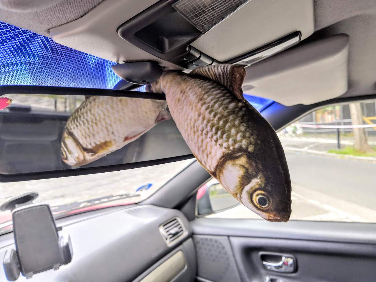 Rybku sem našel v 15 letech v itálii. Asi jí ztratilo nějaký dítko. Od prvního auta se vozí na zrcátku. Jinak semnou na zadnim platě jezdil větší červenej dinosaur. Jenže se po letech rozpad díky slunci a s těžkym sdrcem sem ho musel obřadně pochovat v nejbližší popelnici. Teď už semnou na zadnim platu jezdí leta veliká myš s vykulenýma vočima. A ty voči kulí na auta jedoucí zamnou.