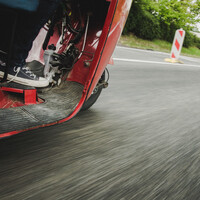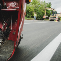 Skoro stojím, když přední osmipalcové kolečko nadskočí přes retardér. Mám pocit asi jako kdybych s běžným autem přejel dvaceticentimetrový obrubník. Pouštím spojku a přidávám plyn, aby i zadní kolečka z hrcnutím retardér přelezla.