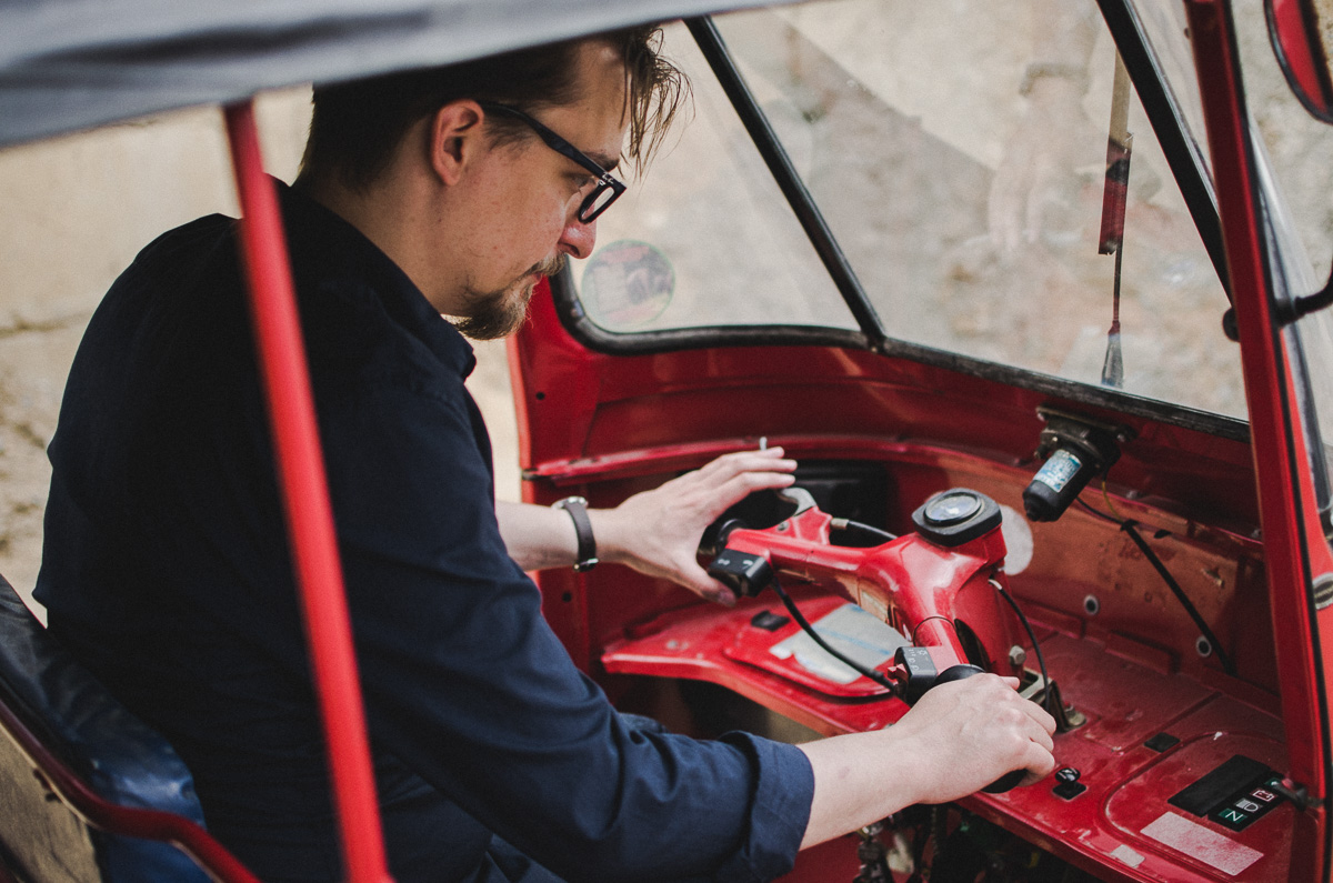 A jak se celá ta věc řídí? Od pohledu musí tuk tuk vypadat jako něco pomalého a velmi nestabilního – což je také do značné míry pravda, i když zdaleka ne tolik, jak byste se mohli bát a nebo jak si představujete, pokud je vaše zkušenost s podobnými stroji omezená na tříkolku Piaggio s nástavbou a metrákovým strojem na espresso uvnitř (a pořádně vysoko). Tento rozdíl ale trošku vhání pochybnosti do plánu děvčat osadit své tuk tuky zahrádkou se zásobami.