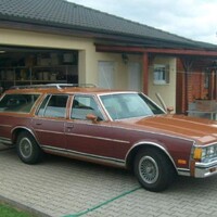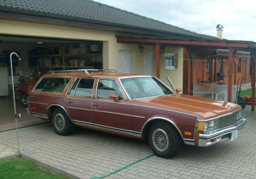 Obrovský hnědý hranatý kombík s dřevěnou tapetou na dveřích (seriozně – je to nábytková tapeta, ne “oficiální” polep, navíc decentně praská a trhá se) mi v inzerci učaroval od pohledu hezkým stavem a zajímavou cenou. Naživo působila tahle loď ještě o trochu větší než na fotkách, v interiéru naopak překvapil celkem skromný prostor. Auto prošlo někdy kdysi dávno poněkud svéráznější mexickou renovací, lak není původní (to byla zlatá metalíza, její zbytky jsou vidět ještě v motorovém prostoru a za různými záhyby), místy je tam více kytu, než by se mi líbilo, sem tam prasklá lišta. Celkově ale nic hrozného a vlastně se to k charakteru “babiččina kombíku” docela hodí.