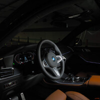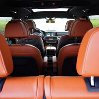 Interiér X7 je na první pohled klasickou kabinou BMW, všechno je tam, kde to u mnichovské značky očekáváte. Ale na druhý pohled už je znát, že tohle BMW patří k těm lepším. Krásná jemná probarvená kůže je skoro všude. A tam, kde není, tak je dekor z intarzovaného dřeva, které vtipně imituje protiskluzný plechový povrch. Strop je potažen alkantarou a obsahuje panoramatické střešní okno. Podsvícené panoramatické střešní okno. A potom ještě jedno střešní okno pro třetí řadu sedadel. Samozřejmě, že ani třetí řada sedadel nemůže být v X7 bez svého střešního okna.