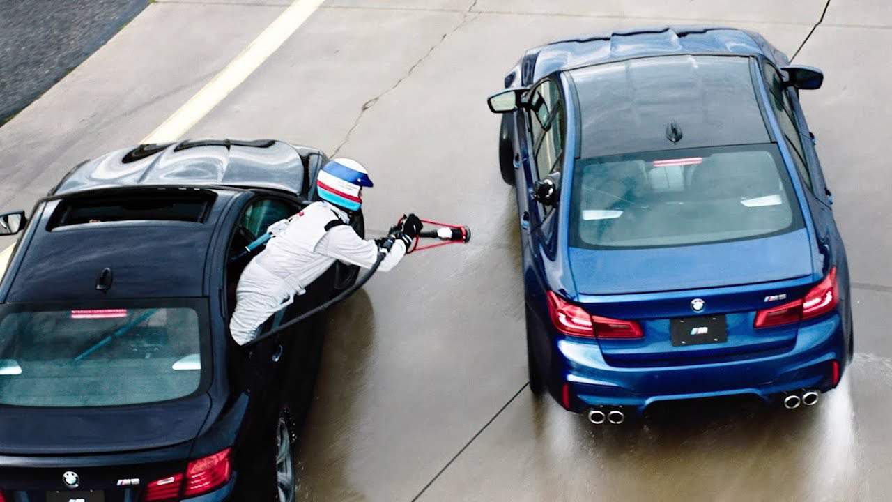 Dohromady pětkrát se během osmi hodin připojila stará M5 na okruh k té nové, aby jí po vzoru vojenských letadel dotankovala během letu driftu. Párkrát se auta potkala blatníky, párkrát skončil Matt Butts málem rozmáčknutý na placku, ale vždycky to nějak klaplo.