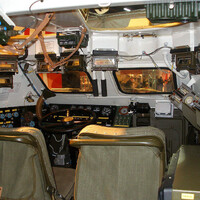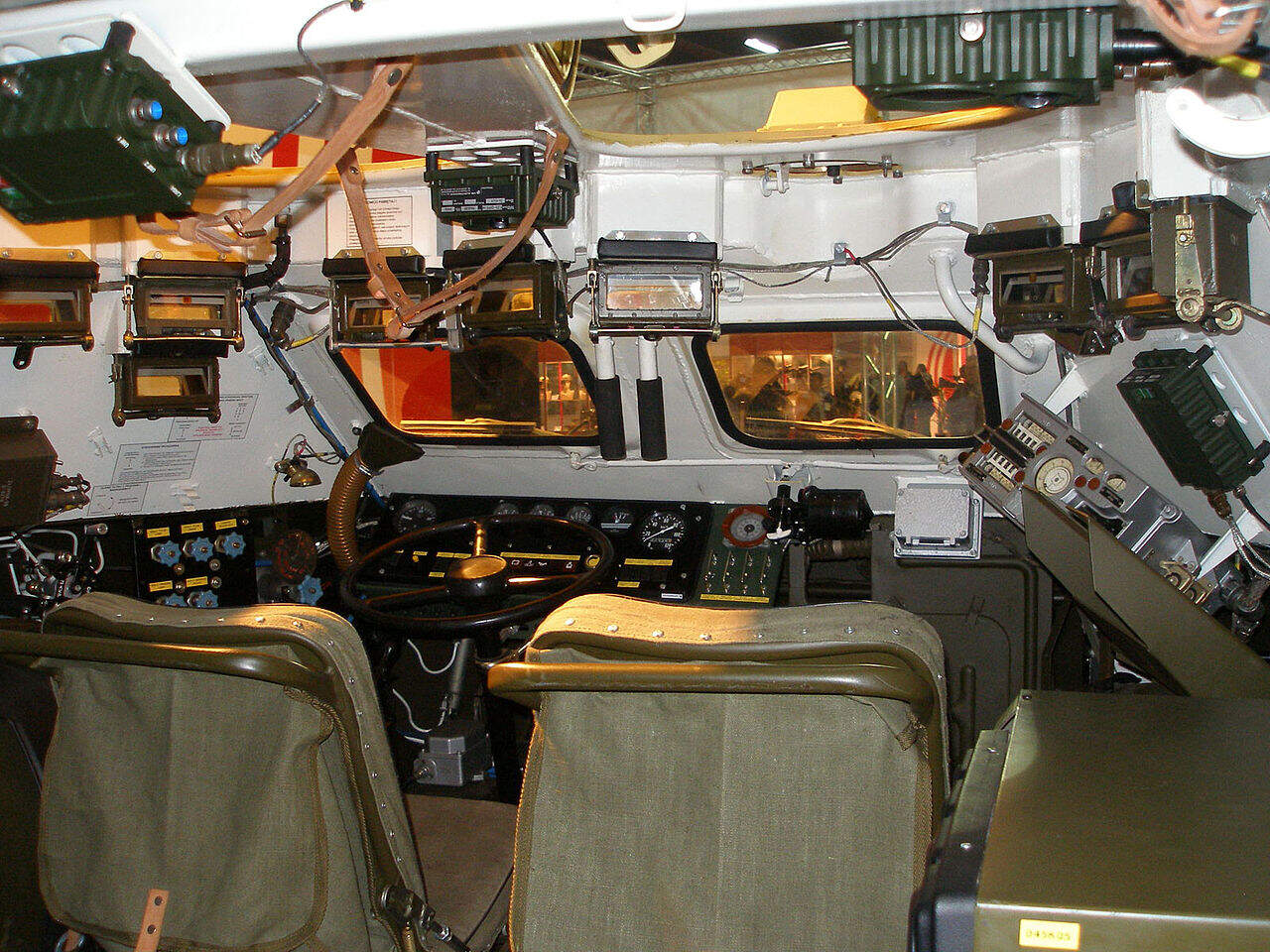 BRDM-2: Velmi útulný interiér obsahoval motor, trysku pro vodní pohon, sklopný podvozek a mechanizmus vodního deflektoru. Posádka se vešla jen tak-tak.