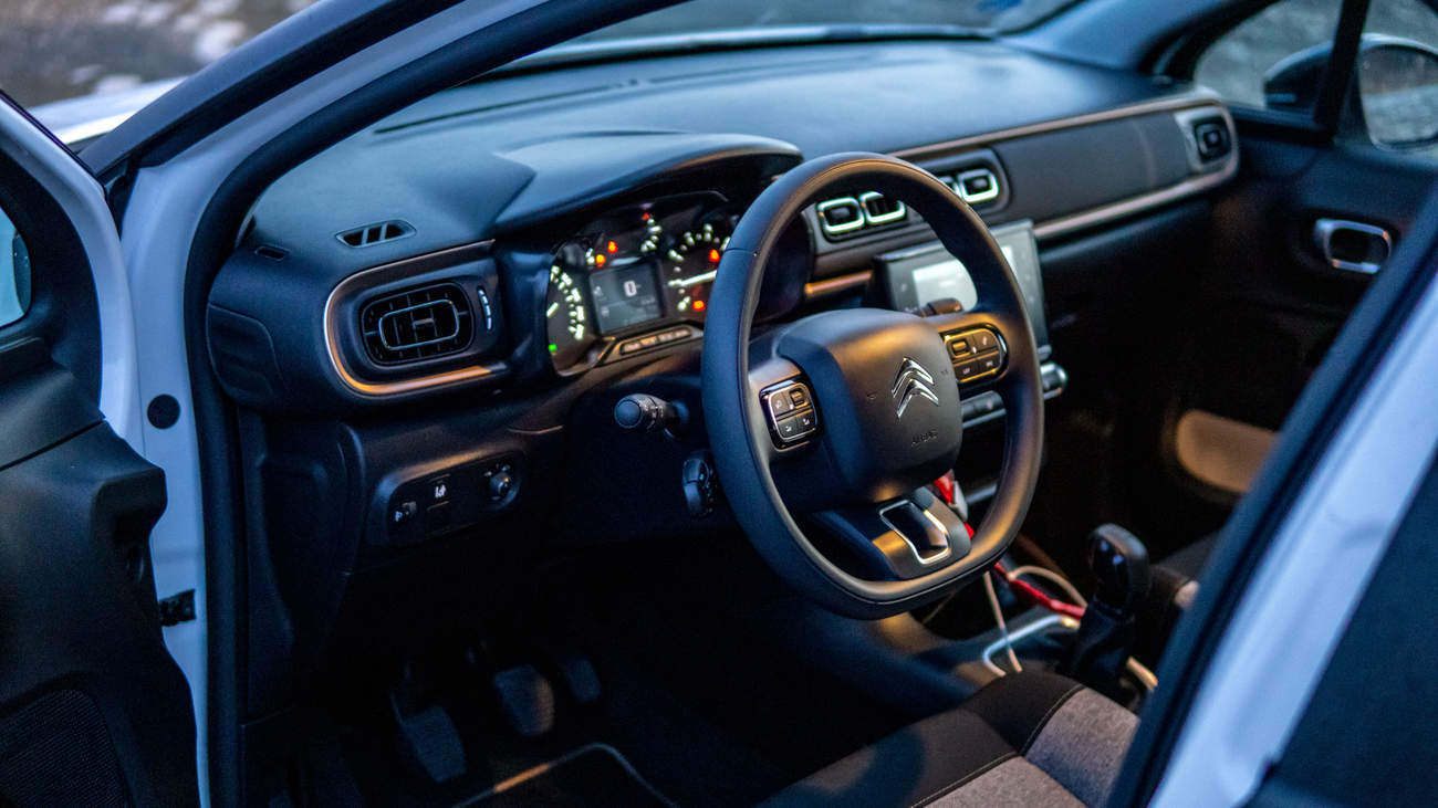 Takže zatímco Peugeot působí dojmem vesmírného kokpitu, kde se pololeží v namodralé záři displejů a ambientního osvětlení, Citroën je prosvětlený obýváček s velmi molitanovými křesílky a barevnými rámečky výdechů klimatizace, které by skoro sváděly do nich nasázet nějaké ty fotky z dovolené. Displej je tu jeden, jeho umístění připomíná televizi pověšenou na zeď – ze středového tunelu zkrátka trčí do prostoru. Moc hezky se tu sedí a přemýšlí, chtělo by to možná nějaký hezký květináč se sukulentem. Ale ten plastový volant a řadička tu trochu překá…jo počkat, ono to je auto, ne čekárna.