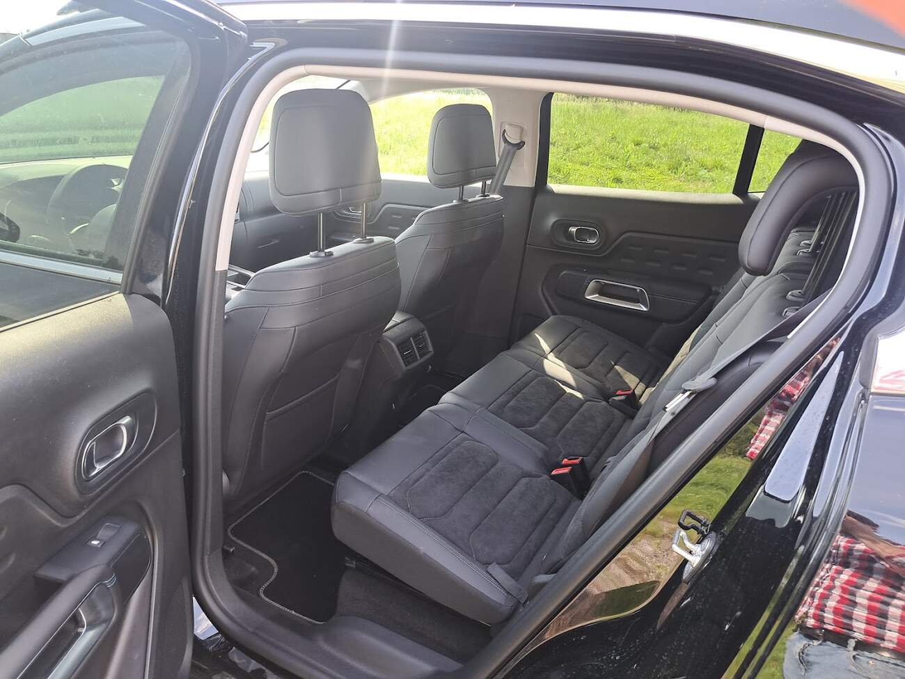 Když už se bavíme o sedadlech, nelze nezmínit typický prvek C5 aircross, kterému se pravidelně podivujeme a který se ani tady nezměnil – totiž posuvná zadní lavice. Ta lze nastavit buď v poloze “docela málo místa na zadních sedadlech a docela dost v kufru”, nebo “ žádné místo na zadních sedadlech a obří kufr”. Fotka níže je vyfocena se sedadly nejvíc vzadu – čili s největší porcí místa pro cestující. A jak vidíte, není to nic extra. Větší děti v sedačce vám téměř určitě okopou opěradla. A když už jsme u těch sedaček -ačkoli to tak na první pohled kvůli třem podobně velkým sedákům vypadá, tři isofixy vedle sebe se vzadu bohužel nenacházejí.