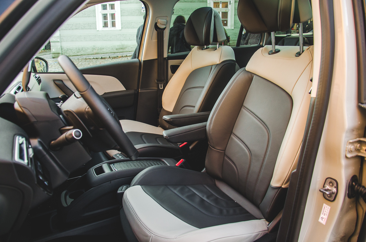 Místem, kde francouzští inženýři popustili uzdu své fantazii, je nepochybně interiér. První věcí, která vás praští do očí, jsou asymetrické sedačky. A nejenom do očí, celou dobu jsem měl takový zvláštní pocit, že se mi na nich podivně sedí. Asi nemám asymetricky tvarované půlky. Hodně se mi líbí opravdu dlouhá palubní deska, díky které může být čelní sklo příjemně skloněné. Jen dopředu upozorňuji, že si musíte objednat vestavěnou navigaci. Pokud totiž nemáte ruce jak čarodějka Saxána, na sklo nedosáhnete, abyste ji přilepili. Marně budete hledat volič řazení na podlaze. Ten je umístěný nad volantem, což velmi oceňuji, ušetří to hodně místa. Akorát bych si dokázal představit trochu masivnější provedení voliče, takhle to vypadá, jako kdyby tam někdo zapíchnul propisku. Měl jsem mírné obavy, abych jej při neopatrném pohybu nezlomil. V rodinném autě rozhodně potěší také velká prostornost a optická vzdušnost. Tu umocňuje ohromné čelní sklo, které si můžete ještě zvětšit posunutím slunečních clon. Takové řešení má bohužel za následek, že kosmetická zrcátka ve stínítkách nejsou osvětlená a chybí stropní madlo nad dveřmi spolujezdce. Něco za něco. S velkým čelním sklem se pojí ještě jedna nepříjemnost. Ostřikovače nejsou příliš silné, takže se k dlouhým stěračům nedostává dostatek vody. Je škoda, že Citroën neintegroval trysky ostřikovačů přímo do stěračů, rozhodně by to pomohlo. Co se variability interiéru týče, nemohu mít výtky. Tři samostatné sedačky vzadu můžete dle libosti posunovat a sklápět a manipulace s nimi je velmi jednoduchá. Spousta odkládacích míst a schránek je samozřejmostí. Výborný nápad je vyjímatelný středový box, jenž svou hloubkou připomíná doly na Karvinsku. Bez problémů pojme dvě velké PET flašky. K dokonalosti chybí Picassu snad jen posuvné boční dveře.