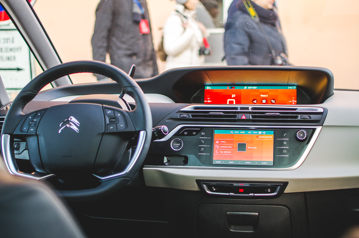 Stejné nadšení ovšem nevzbuzují palubní asistenti a moderní technologie všeho druhu, kterými může být C4 Picasso doslova prošpikované. Přijde mi, že jejich realizace zůstala vždy někde na půl cesty. První věcí, která mě rozpálila do běla, bylo elektrické otevírání pátých dveří. Sám o sobě je to skvělý pomocník, tím spíš, když má funkci otevření pomocí kopu pod zadní nárazník. Bohužel ve Francii asi nemají výkonné elektromotorky, protože otevření víka kufru je strašlivě pomalé. Takže nechápu, proč v interiéru není tlačítko na otevření zavazadlového prostoru, které by člověk zmáčknul při vystupování z auta, aby to bylo otevřené až dojde dozadu. Takhle musíte dát povel tlačítkem na pátých dveřích a vystát důlek než bude zpřístupněn kufr. Nemilé překvapení mě čekalo ve chvíli, kdy jsem se rozhodl vyzkoušet systém pro udržování v jízdních pruzích. Trochu jsem se divil, že při převzetí vozu byl daný pomocník vypnutý, protože většinou bývají tyhle věci aktivní. Brzy jsem pochopil proč. Není plně samostatný, jako například podobný systém v dříve testované Optimě. V Citroënu funguje tak, že pokud se blížíte ke krajnici, auto by vám mělo mírně naznačit pohybem volantu do protisměru, že byste měli upravit stopu. Jenže C4 Picasso to naznačí natolik důrazným způsobem, že jsem po jeho zásahu skončil ve vedlejším jízdním pruhu. Štěstí, že vedle mně v danou chvíli nic nejelo, tohle by byl kolosální karambol. Podobně vtipný je tempomat, honosící se přídomkem aktivní. Čekali byste od něj, že dokáže i sám brzdit, že? Omyl v Picassu to vypadá tak, že aktivně sundá imaginární nohu z plynu, ale dobrzdit musíte sami (pozn. autora – Citroën nabízí za příplatek i systém, který zvládne auto zcela zastavit. Přesto se mi zdá označení zkoušené verze tempomatu slovem aktivní jako poněkud matoucí). Podobně smíšené dojmy mám také z parkovací kamery, která má funkci 360°. Ta umí složit obraz tak, že umožní pohled z ptačí perspektivy a vy máte dokonalý přehled o okolním prostoru. Háček je v tom, že kamera funguje jen když na voliči převodovky máte zařazené R a ve chvíli jej přesunete na D, tak se vypne. Přijde mi, že přední kamera tím pádem trochu postrádá svůj smysl. Malou náplastí je aktivní parkovací asistent, který dokáže zaparkovat vůz do poměrně úzké mezery a funguje na výbornou. Pokud máte s parkováním problémy, za tohle si rozhodně připlaťte.