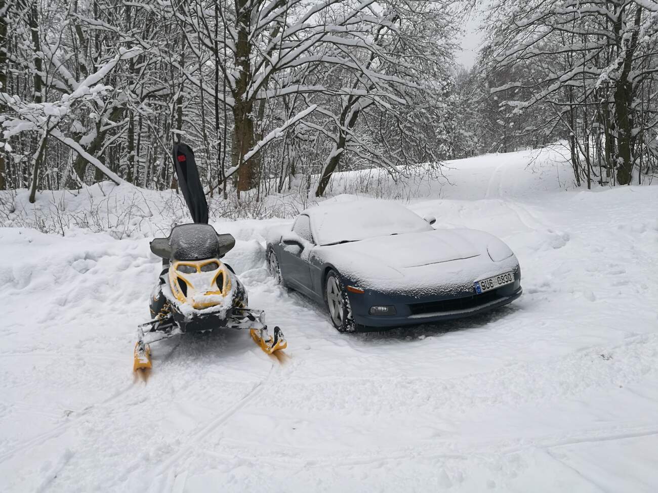 Když používáte auta, která jsou stvořená pro nějaký účel, pro účel zcela jiný, často se začnete potýkat se situacemi, které vás rozesmějí (nebo rozesmutní), protože vám dojde, že zákony fyziky s námi jsou stále, ať se nám to líbí, nebo ne. Na jedné z fotek najdete C6ku zapadanou sněhem. Nečekal jsem, že bych z místa odjel bez pomoci, a tak jsem požádal své kamarády z chalupy, aby mi pomohli auto vytlačit a připravit na odjezd. Přijeli na sněžných skútrech, do auta ležérně zatlačili a za zvuku vytočených dvoutaktů je pohltil zvířený sníh. Já Vette nastavil čumákem z mírného kopce, na „tvrdé“, jen s lehkým popraškem sněhu, zabrzdil, vystoupil, naplnil kufr kravinami a… už jsem se nerozjel. To všechno proto, že při dobrzdění se na posledních pár centimetrech zablokovala kola, čímž před sebou vytvořila několik milimetrů vysoký klín sněhu. To spolehlivě stačí na to, aby 285 mm široký válec na zadní nápravě při rozjezdu neměl dostatek trakce a rozpačitě prokluzoval. V jednom člověku roztlačovat automat z kopce je zhola nemožné (ale humorné, stačí se podívat na YT videa, jak podobná aktivita dopadá). Vše vyřešil klacík, zhruba 30 minut času a šťourání těch pár milimetrů před pneumatikami.
