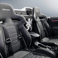 Závěrem ještě jmenujme několikero doplňků, které připomínají historii vozů škoda jako hvězd tuningových srazů na přelomu tisíciletí. Je tu nastavitelné barevné podsvícení pod autem (v barvách trikolory), hodněmoc reproduktorů, subwoofer navíc vybavený apartní malbou lva, velká kola s Kodiaqa, jinak barevné zadní křídlo a sedačky Sparco.